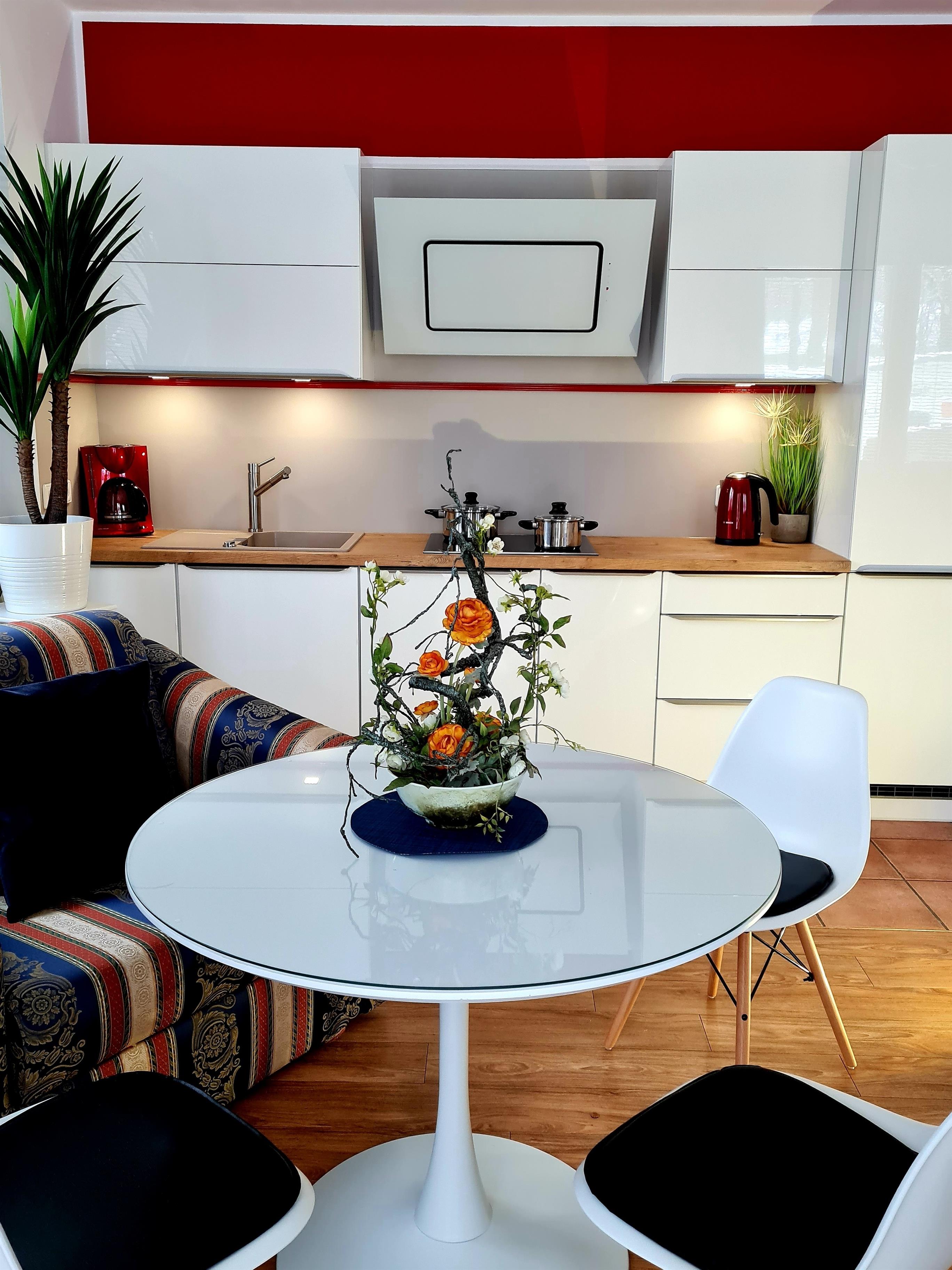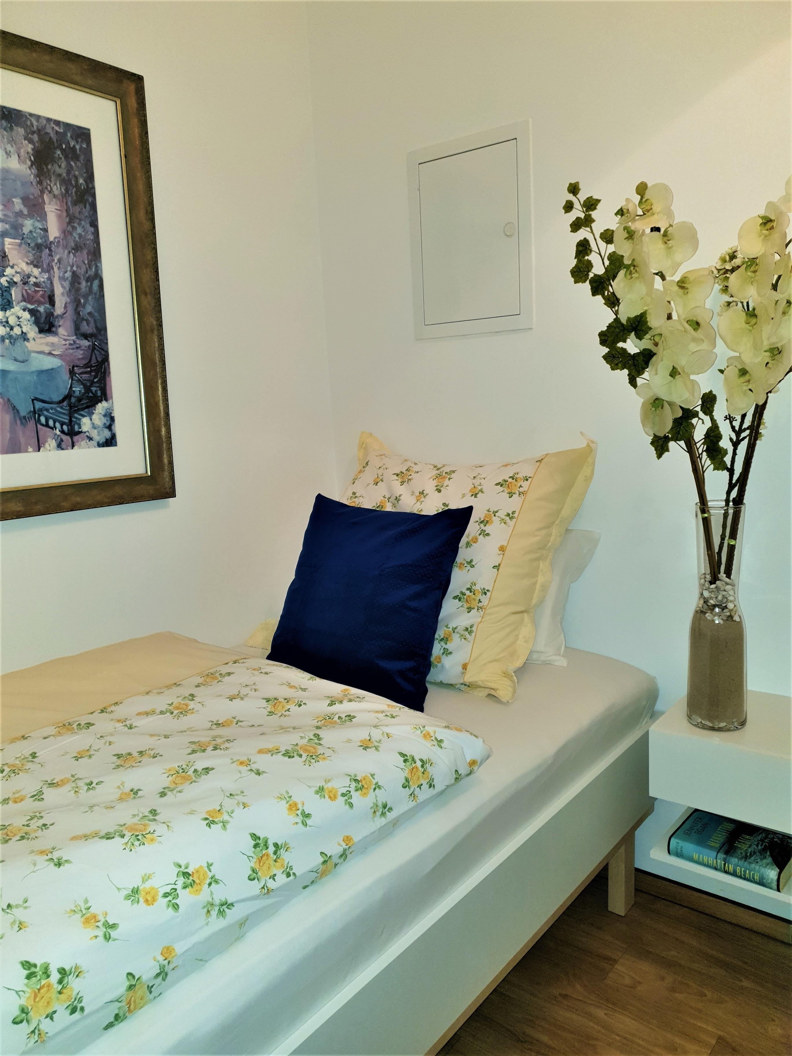 Die Ferienwohnung ist mit schönen Bildern, komfortablen Betten und modernen Möbel ausgestattet. Zum Apartment gehört ein Balkon mit bequemen Liegestühlen.