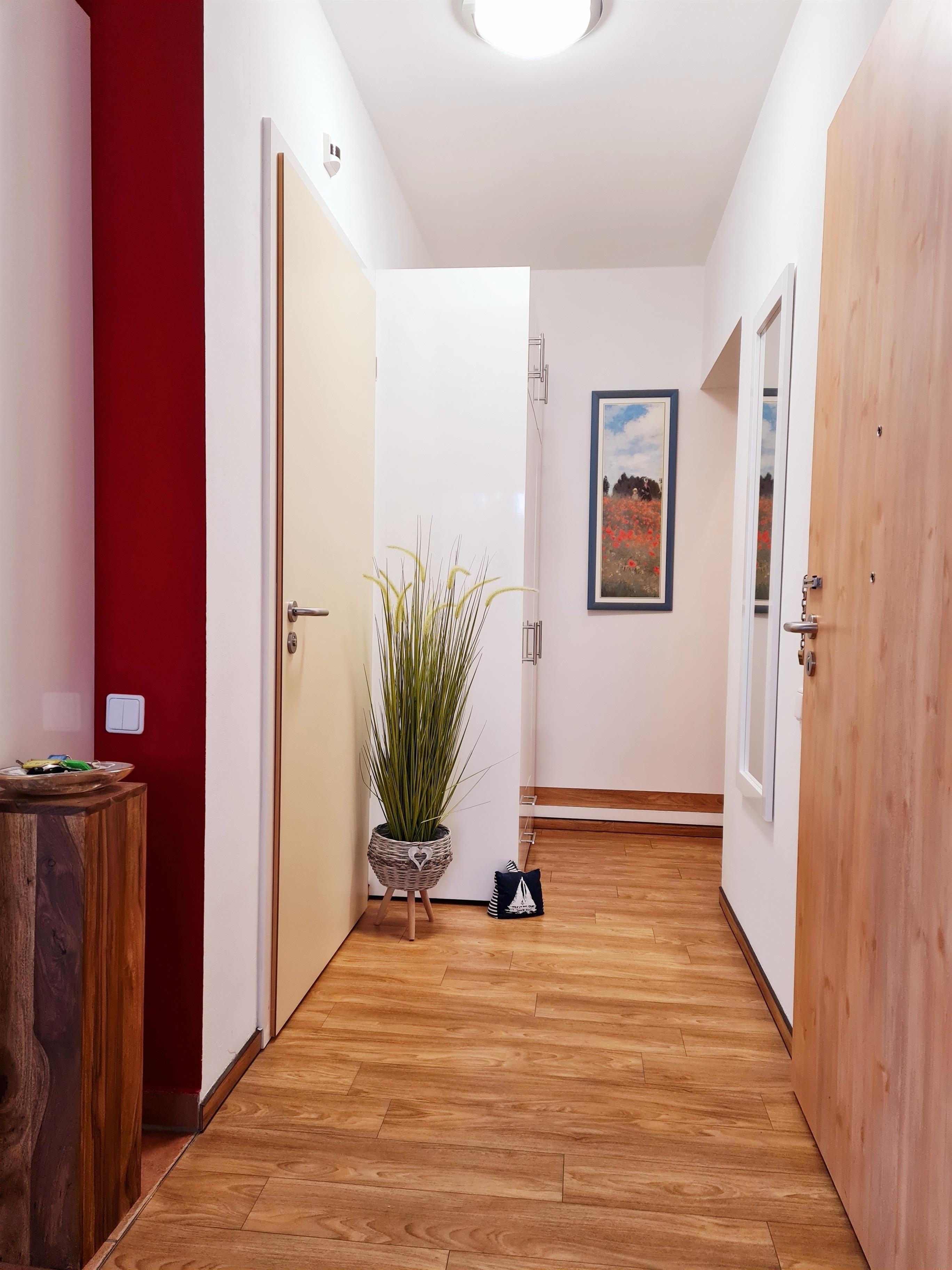 Im großzügigen Dielenbereich ist ein Kleiderschrank mit eingebauten Wandtresor sowie ein ganz Körper Spiegel.
