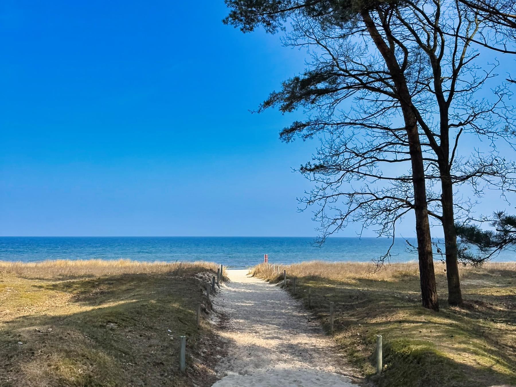Durch die erhöhte Düne genießen Sie von der Terrasse, aus der Küche und dem Wohnzimmer einen wunderschönen Blick durch den Kiefernwald bis zur Ostsee.