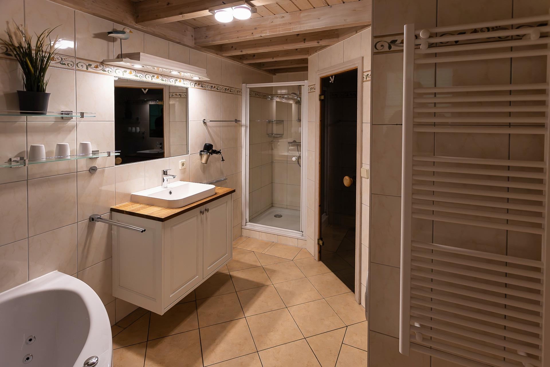 Badezimmer mit Sauna und Whirlpool-Badewanne