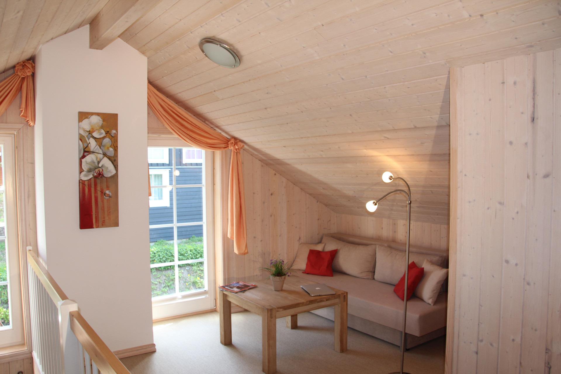 Große Fenster ermöglichen viel Tageslicht. Fußboden - Gaszentralheizung und Kaminofen sorgen auch im Winter für ein „Wohlfühlklima“. Waschmaschine, Geschirrspüler, Mikrowelle, Kaffeemaschine, Toaster, die Küche ist voll eingerichtet. Kabelfernsehen, HD – fähige Flatscreen, DVD, CD, I – Pod Dockingstation, freier Internetzugang - alles was das tägliche Leben so angenehm macht, ist vorhanden. Drei Schlafzimmer – zwei im Obergeschoss (eins mit zusätzlichem LCD - Fernseher) und eins im Erdgeschoss bieten Platz für 6 Personen. Auf der Galerie steht ein gemütliches Schlafsofa. Dort gibt es Platz für zwei weitere Personen. Ein weiteres Duschbad im Obergeschoss rundet den "Luxus“ ab. Im Untergeschoss finden Sie eine offene Küche mit großem Tisch für acht Personen, einen gemütlichen Wohnbereich mit Kaminofen und ein Wellnessbad mit Whirlpool, Dusche, Waschtrockner und Sauna. Im Außenbereich befindet sich eine große Terrasse mit Tisch, Stühlen, zwei Sonnenliegen und Sonnenschirm.