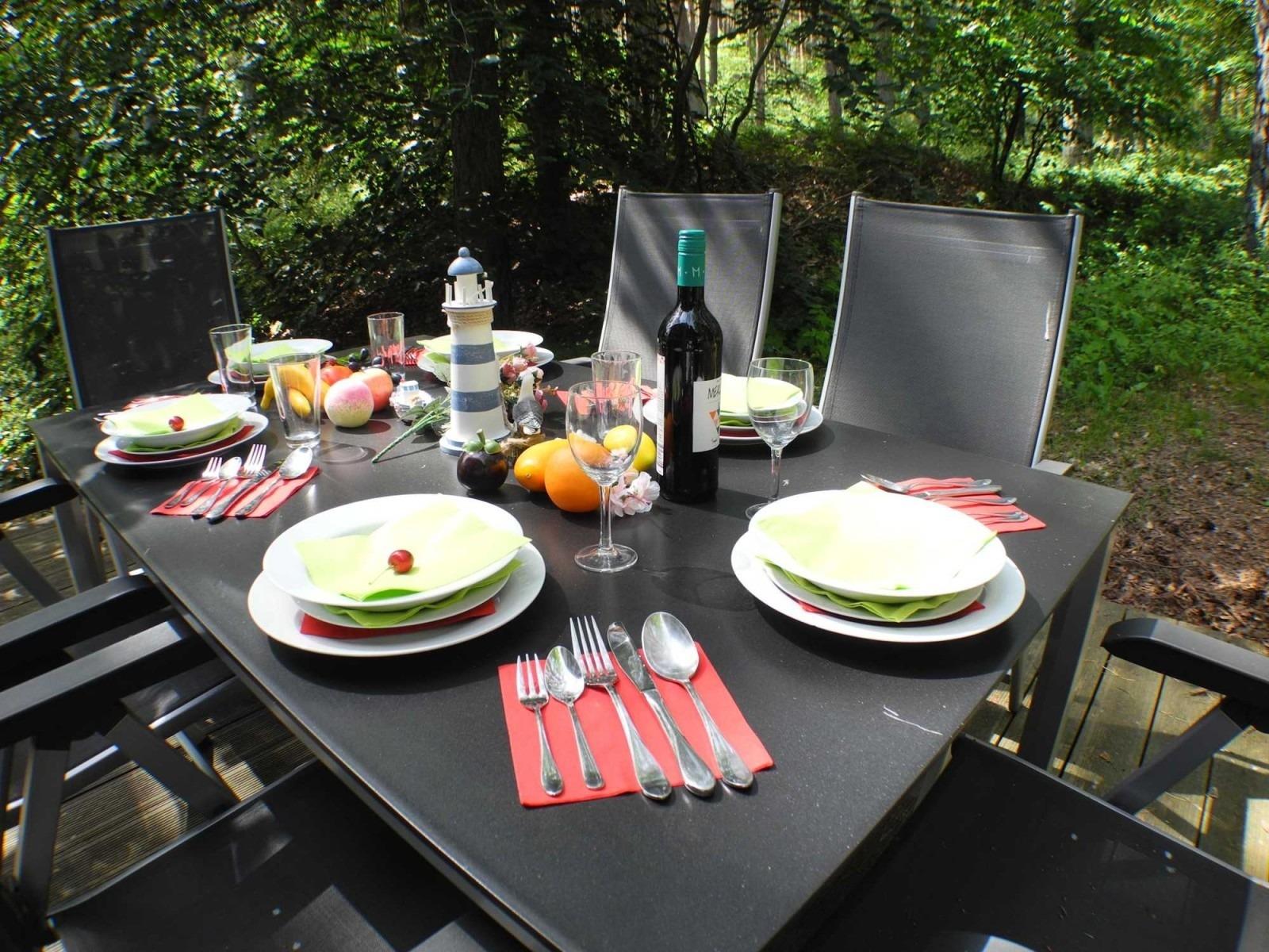 Über den Wohn- und Essbereich gelangen Sie auf die Holzterrasse mit den Gartenmöbeln. Gönnen Sie sich ein ausgiebiges Frühstück an der frischen Luft oder genießen Sie in Ruhe die schönen Sonnenstunden. Ein kleiner Balkon, welcher von beiden Schlafzimmern im Obergeschoss betreten werden kann, bietet eine weitere Möglichkeit die herrliche Natur und die Meeresluft zu genießen.
