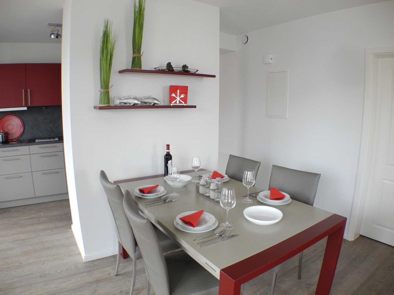Die Küche ist mit allem was das Herz begehrt ausgestattet (inkl. Teegeschirr und -sieb, Mixer, Wasser- und Eierkocher) und ermöglicht Ihnen ein zauberhaftes Mahl für Ihre Liebsten zu zaubern. Die liebevoll zubereiteten Speisen können Sie dann in aller Ruhe gemeinsam in der hellen Essecke verzehren.