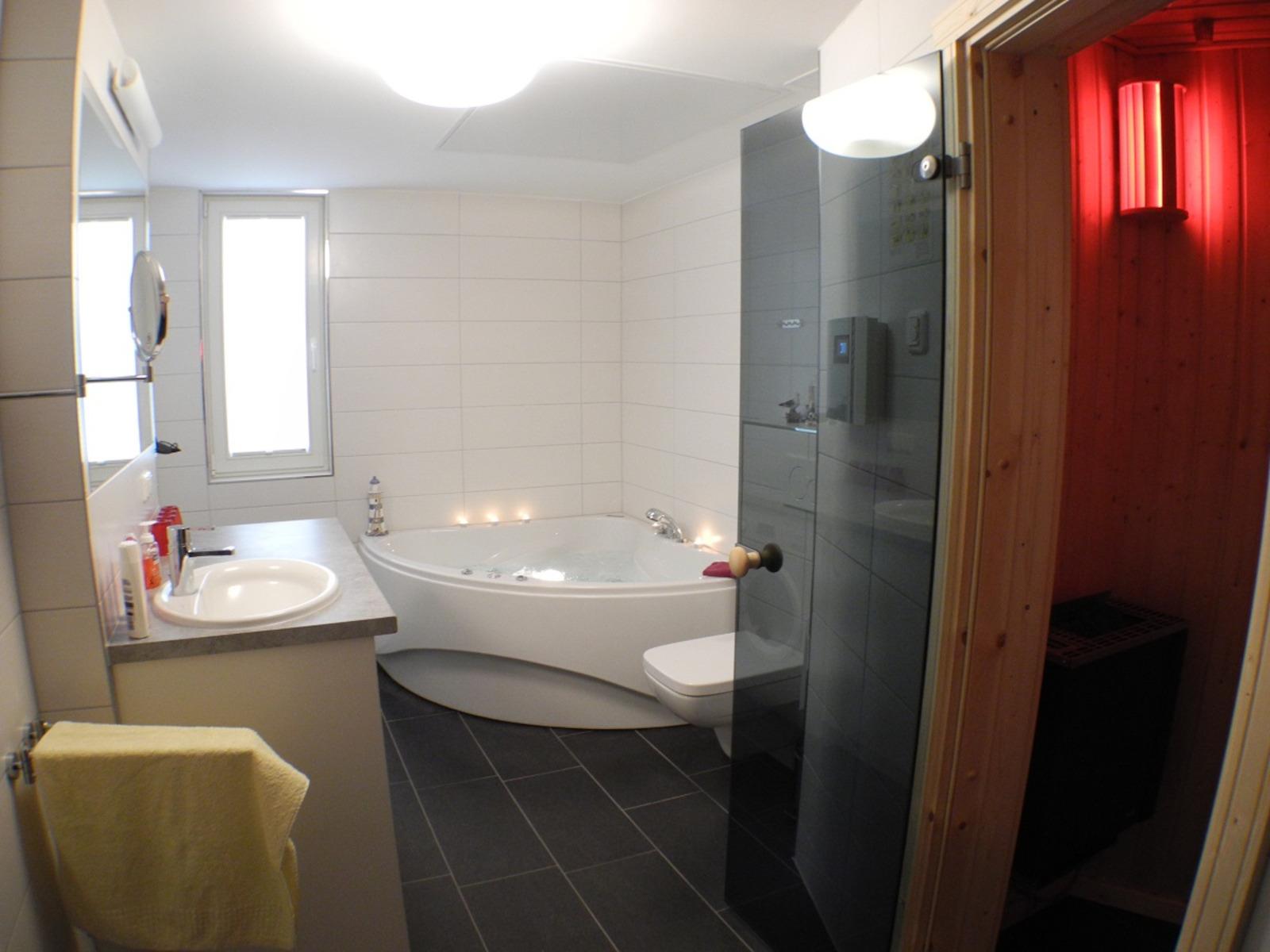 Nach einem erlebnisreichen Urlaubstag können Sie sich komplett in unserem Wellnessbad mit Bio-Sauna, Eckbadewanne und Dusche erholen. Lassen Sie einfach die Seele baumeln und vergessen Sie den Alltag. Ein zusätzliches Bad mit Dusche und WC ist ebenfalls vorhanden.