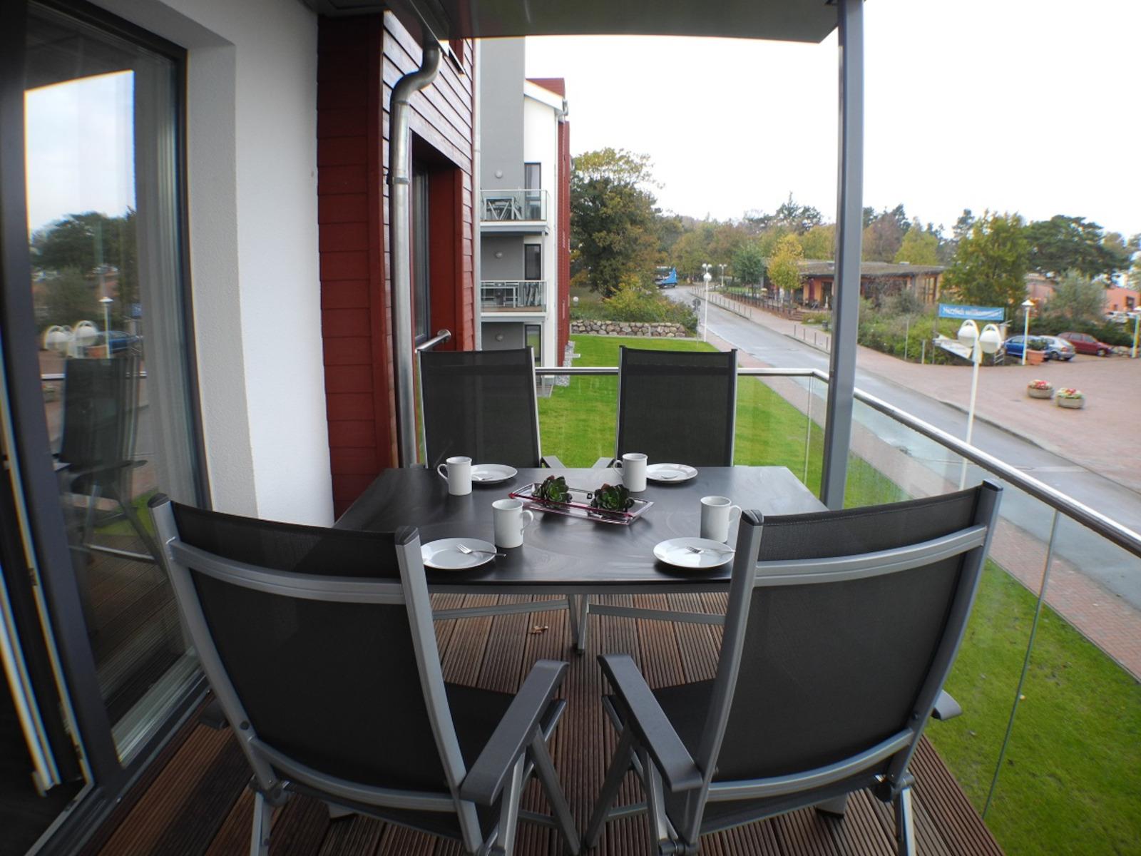 Den Balkon, mit wunderschönem Blick über die Kuranlagen zur Strandpromenade, erreichen Sie über den Wohn- und Essbereich. Starten Sie ganz entspannt in den Tag und genießen ein ausgiebiges Frühstück an der frischen Ostseeluft.