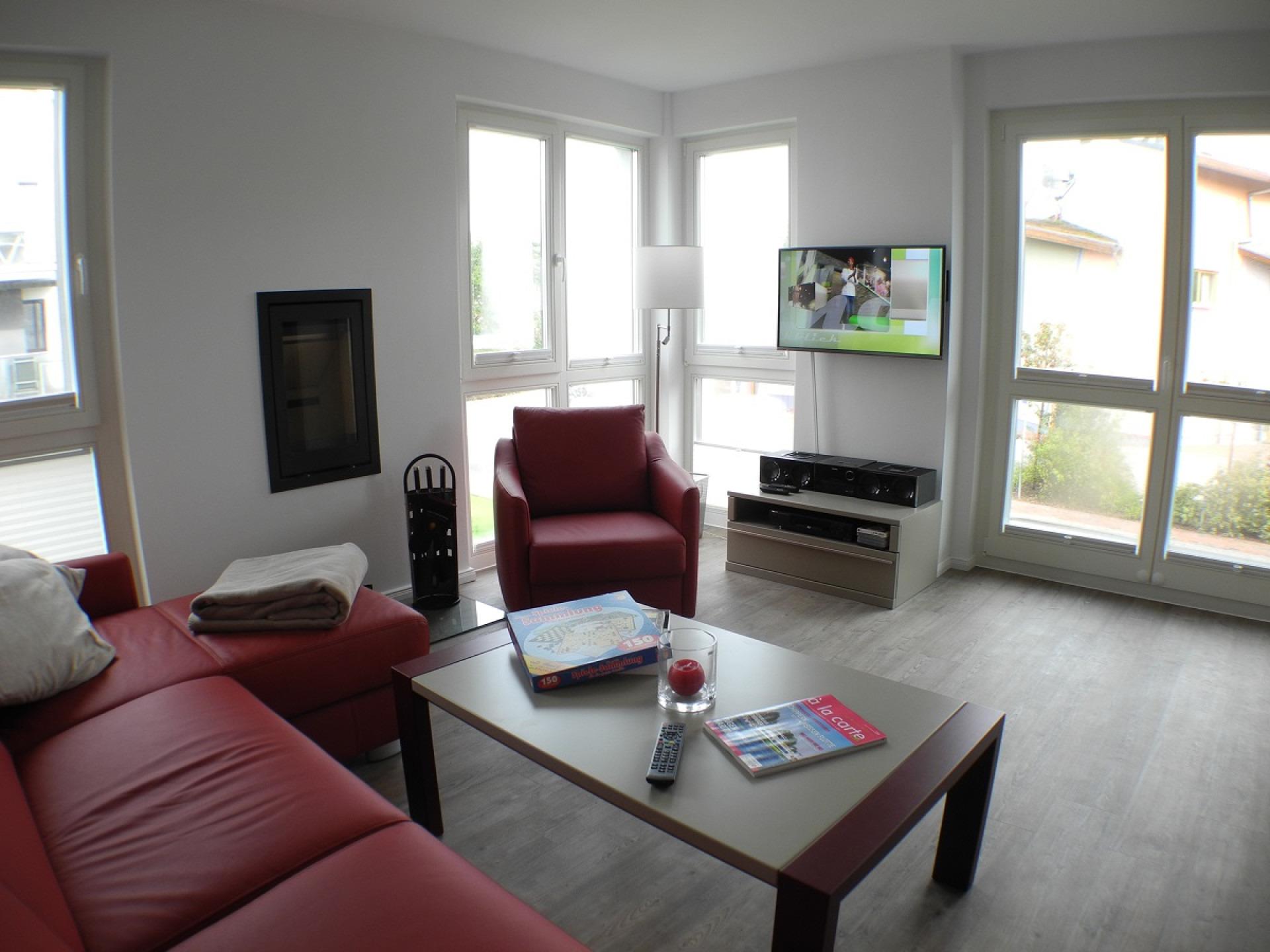 Einen ersten Blick auf den gemütlichen Wohn- und Essbereich können Sie beim Betreten der Wohnung erhaschen. Im Wohnbereich steht Ihnen ein bequemes Sofa mit Sessel zur Verfügung. Ein Kamin sorgt für romantische Atmosphäre und bietet zusätzlich angenehme Wärme an Herbst- oder Wintertagen.