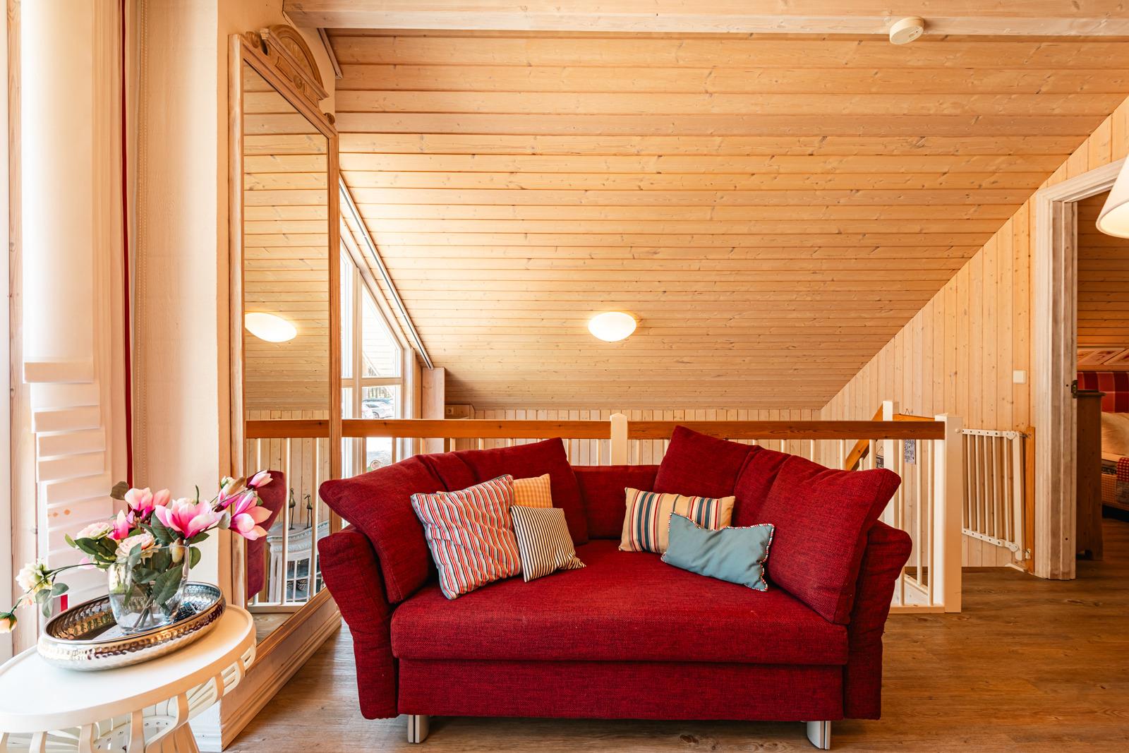 Entspannen Sie vor dem Kamin im Wohnbereich, genießen Sie ein Glas Wein auf der großen Holzterrasse oder relaxen Sie im Wellnessbad mit Whirlpool und hauseigener Sauna - hier werden Urlaubsträume wahr. Lassen Sie Ihren Gedanken freien Lauf, während Sie vom gemütlichen Sofa auf der Galerie den wunderbaren Ostsee-Blick genießen.