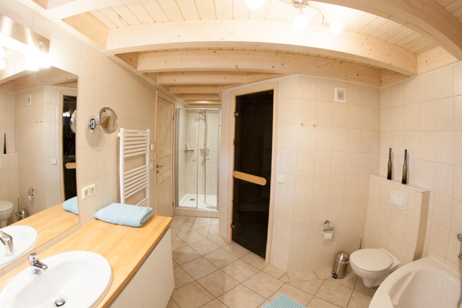 Das Highlight vom Erdgeschoss ist das Wellnessbad ausgestattet mit Sauna, Whirlpool und separater Dusche. Hier können Sie nach einem aktiven Tag die Seele baumeln lassen und Entspannung genießen.