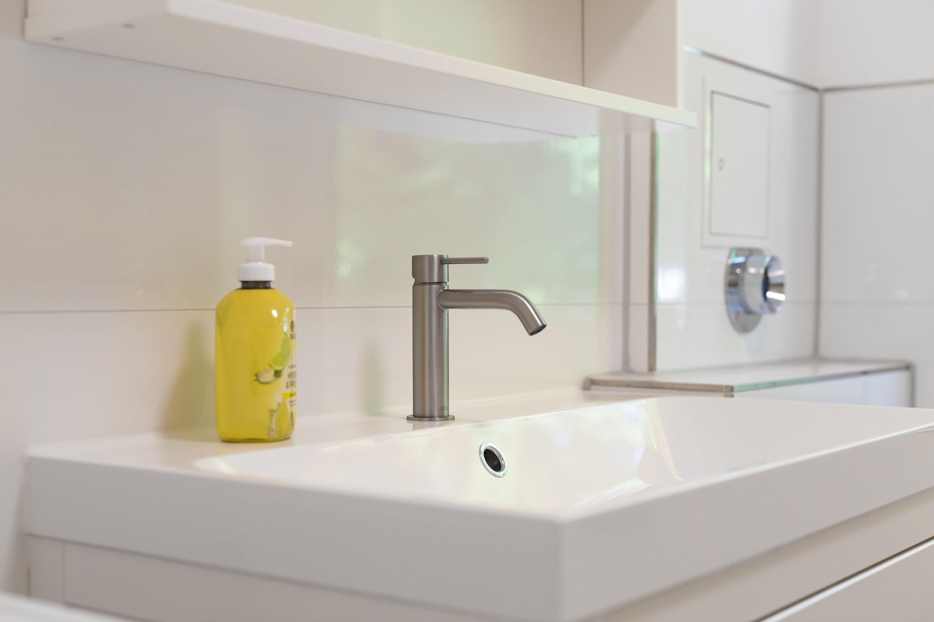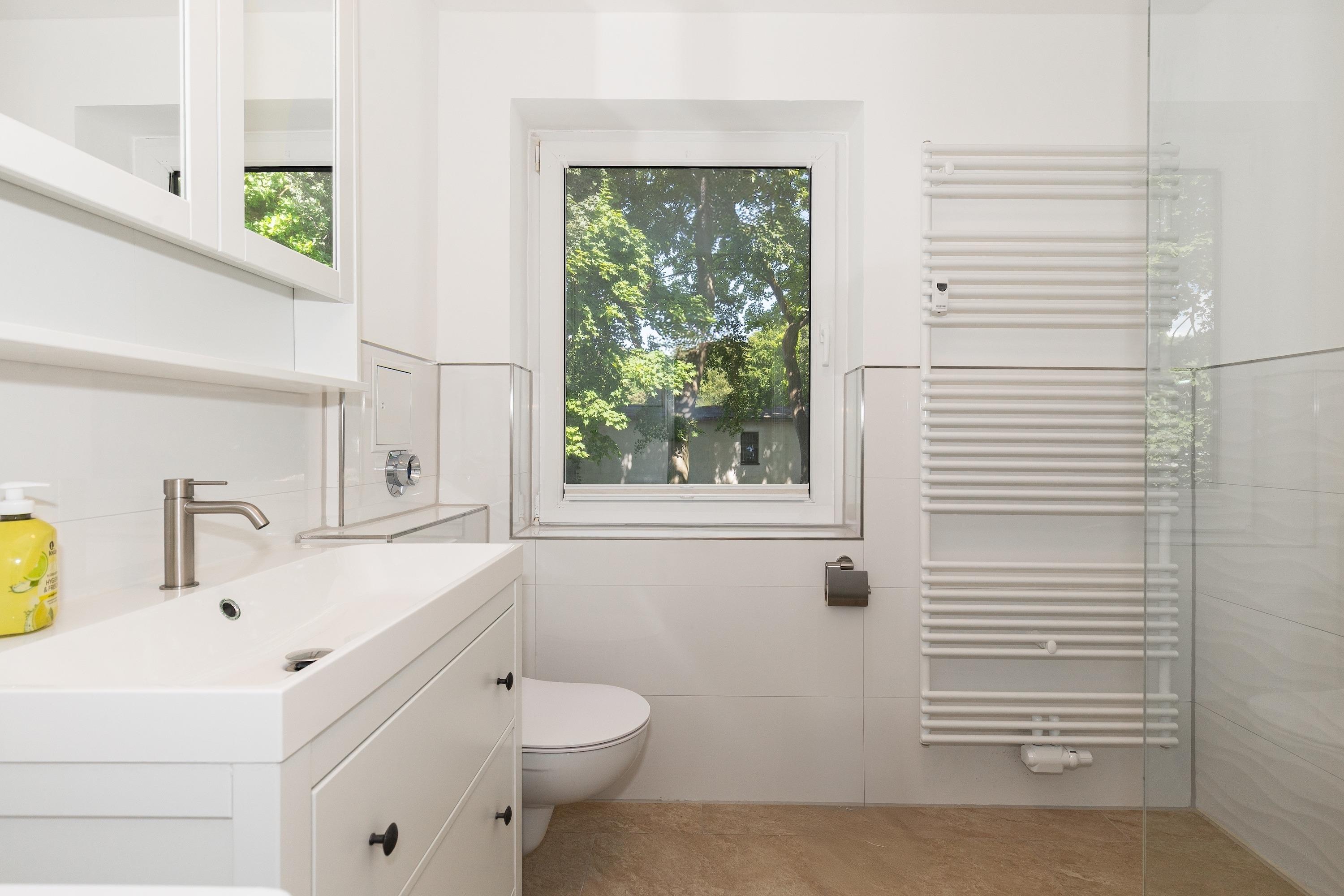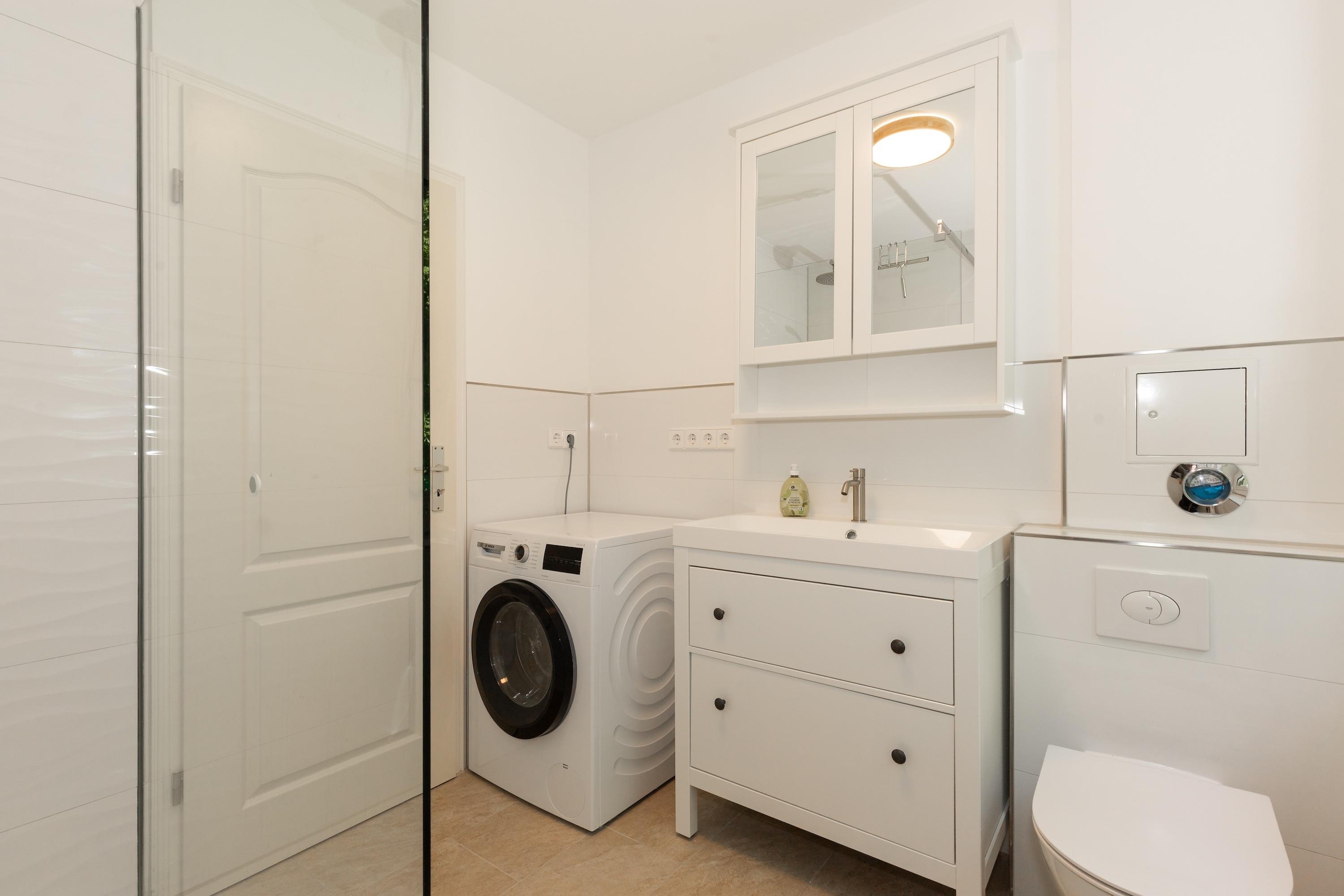 Das moderne Badezimmer verfügt über eine ebenerdige Dusche sowie eine Waschmaschine, ideal auch für längere Aufenthalte. Kostenloses WLAN ist selbstverständlich vorhanden, ebenso wie ein eigener Parkplatz direkt an der Wohnung – bequem und stressfrei.