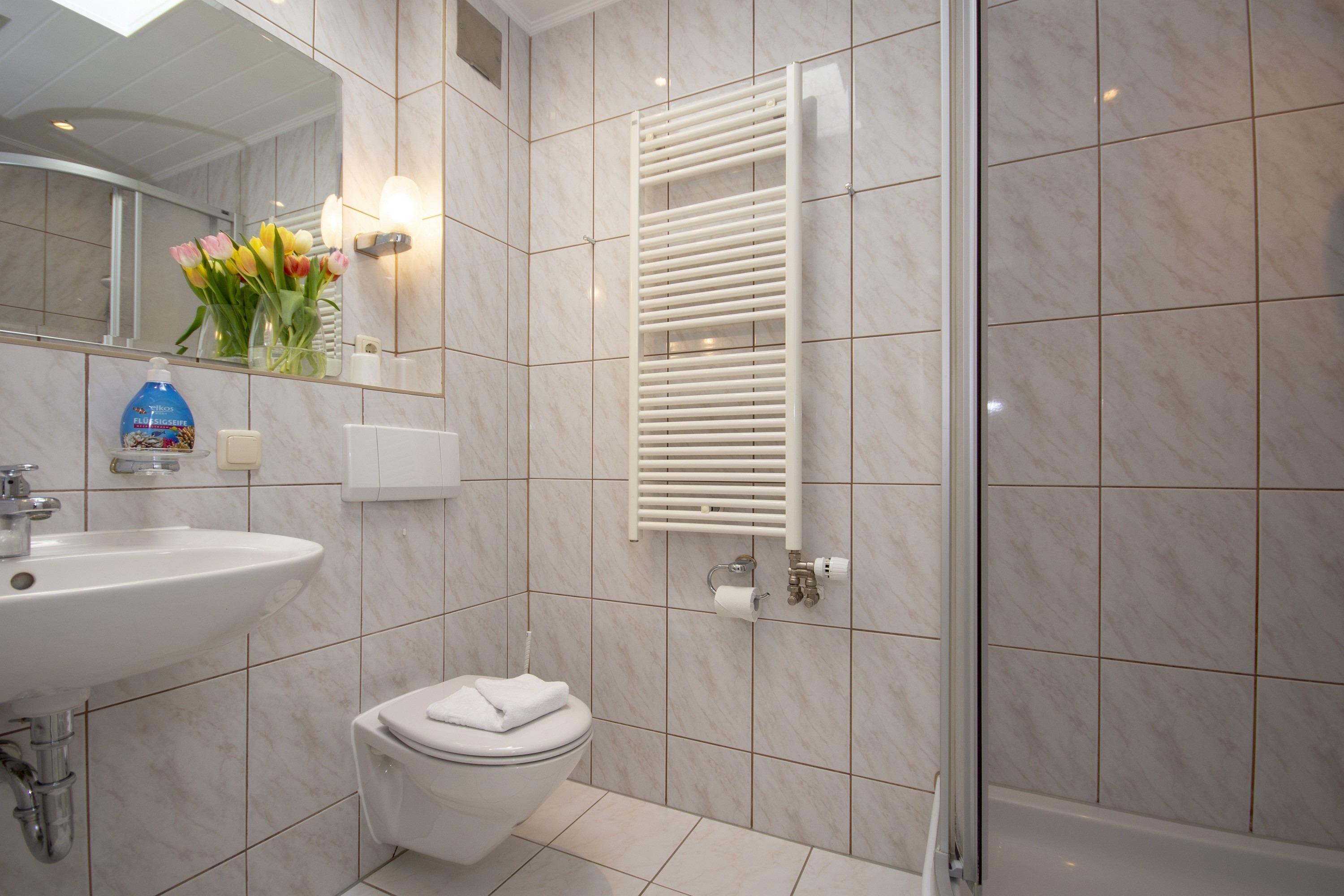 Das Badezimmer verfügt über eine Dusche, WC und einen Waschtisch mit großen Spiegel.