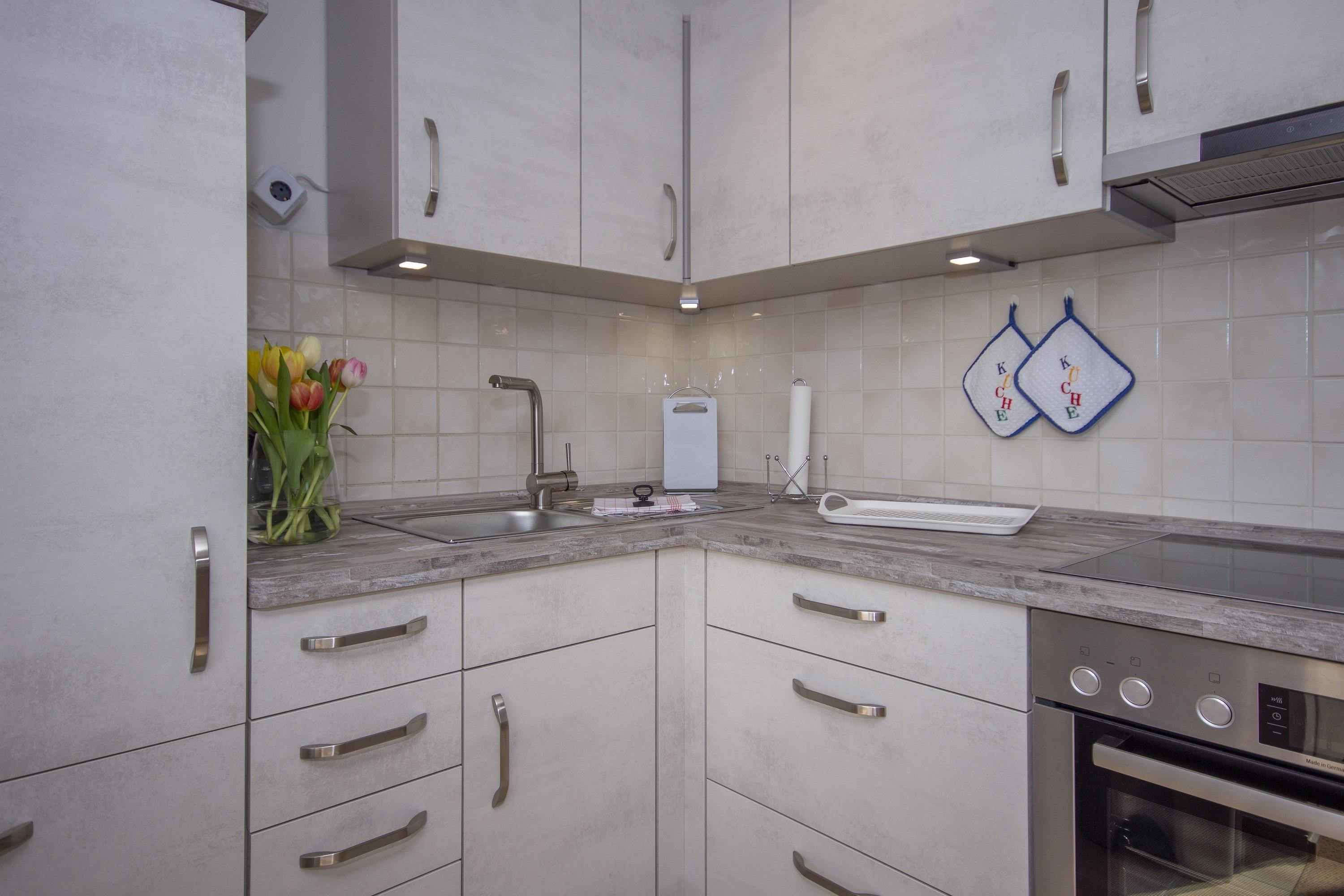 In der Wohnung befindet sich eine offene, voll ausgestattete Küche mit Spülmaschine, Herd, Cerankochfeld und Mikrowelle. Zahlreiche Küchenutensilien eröffnen Ihnen die Möglichkeit, einen kulinarischen Kochabend zu verleben.