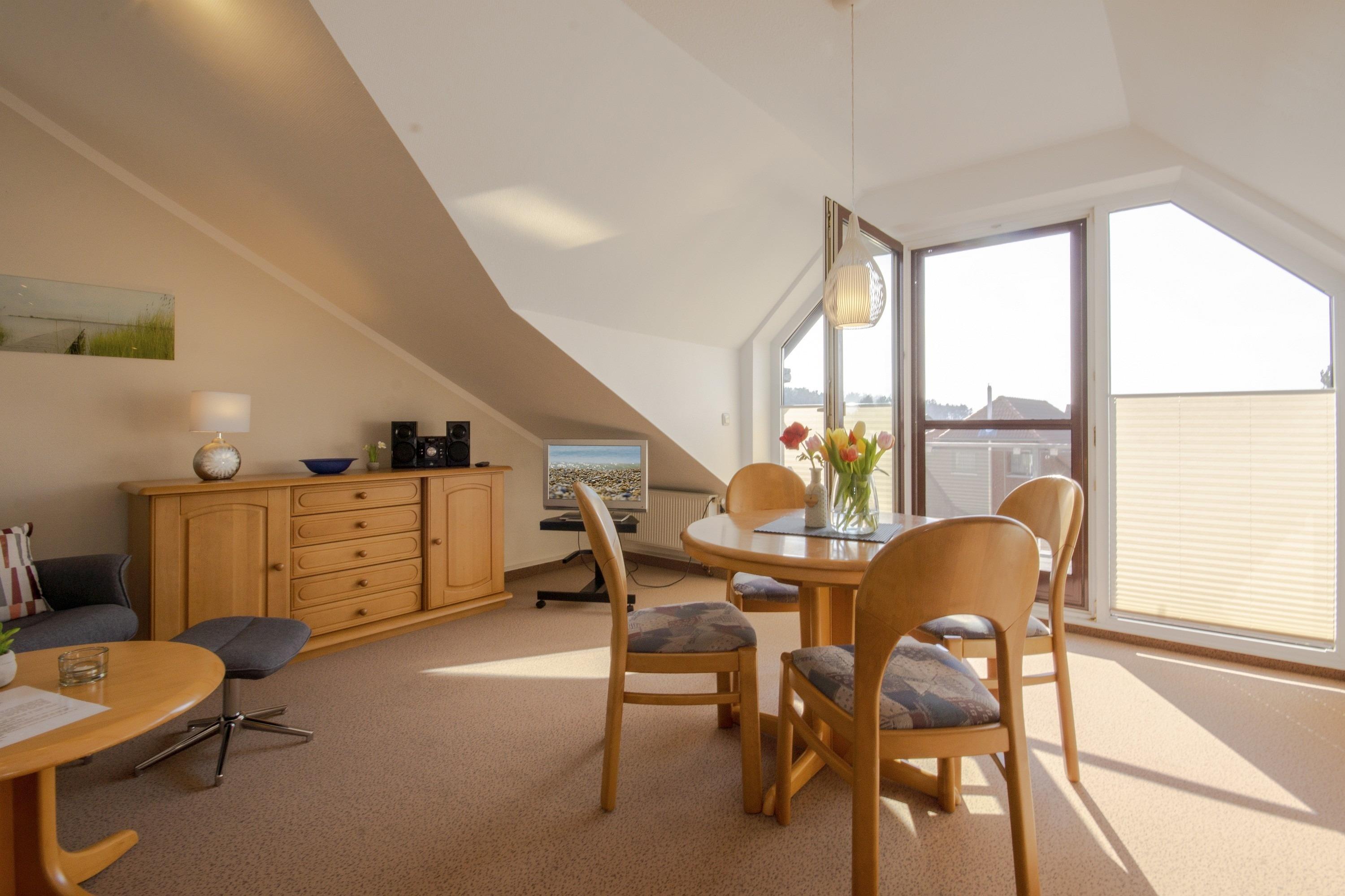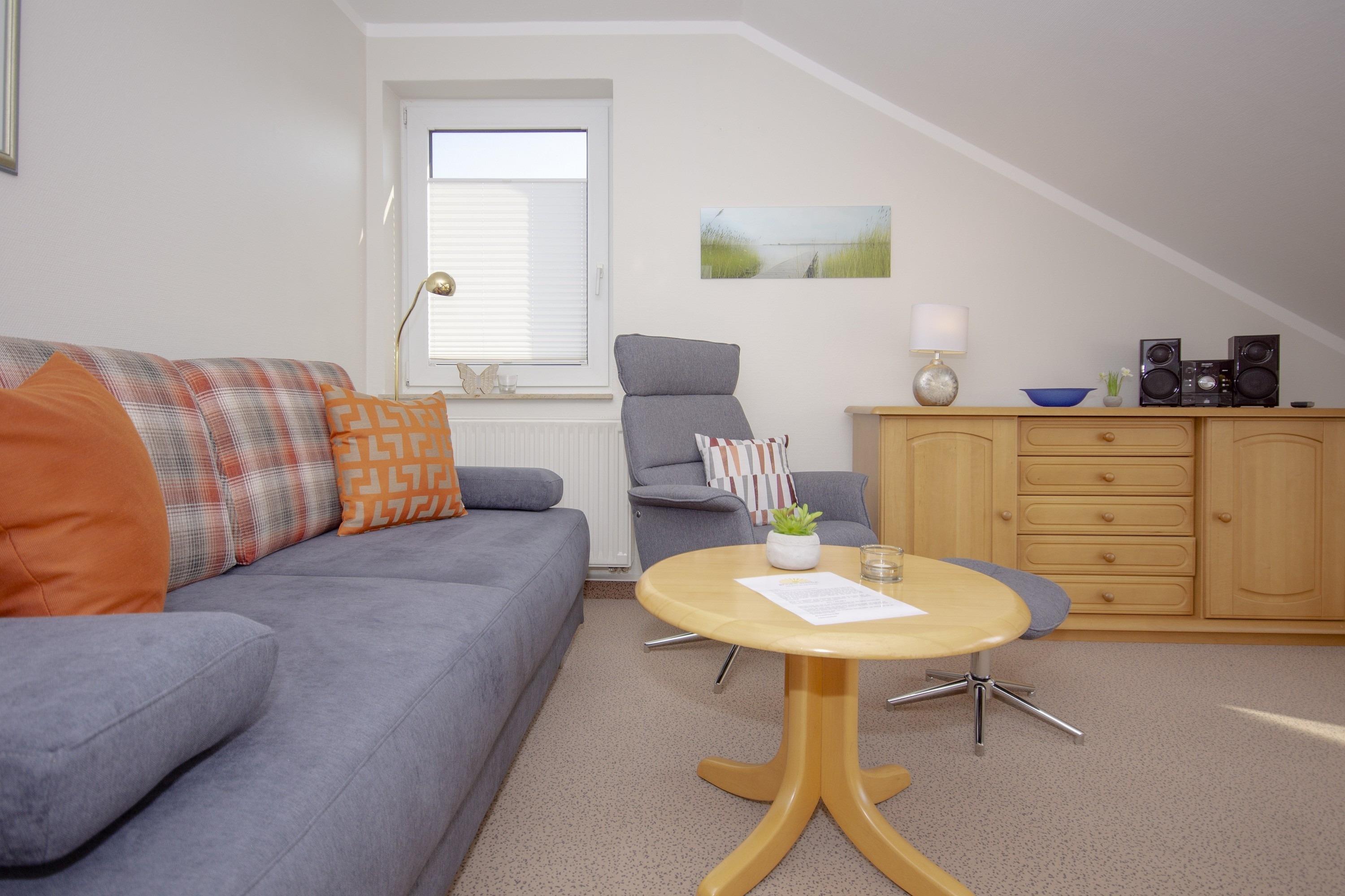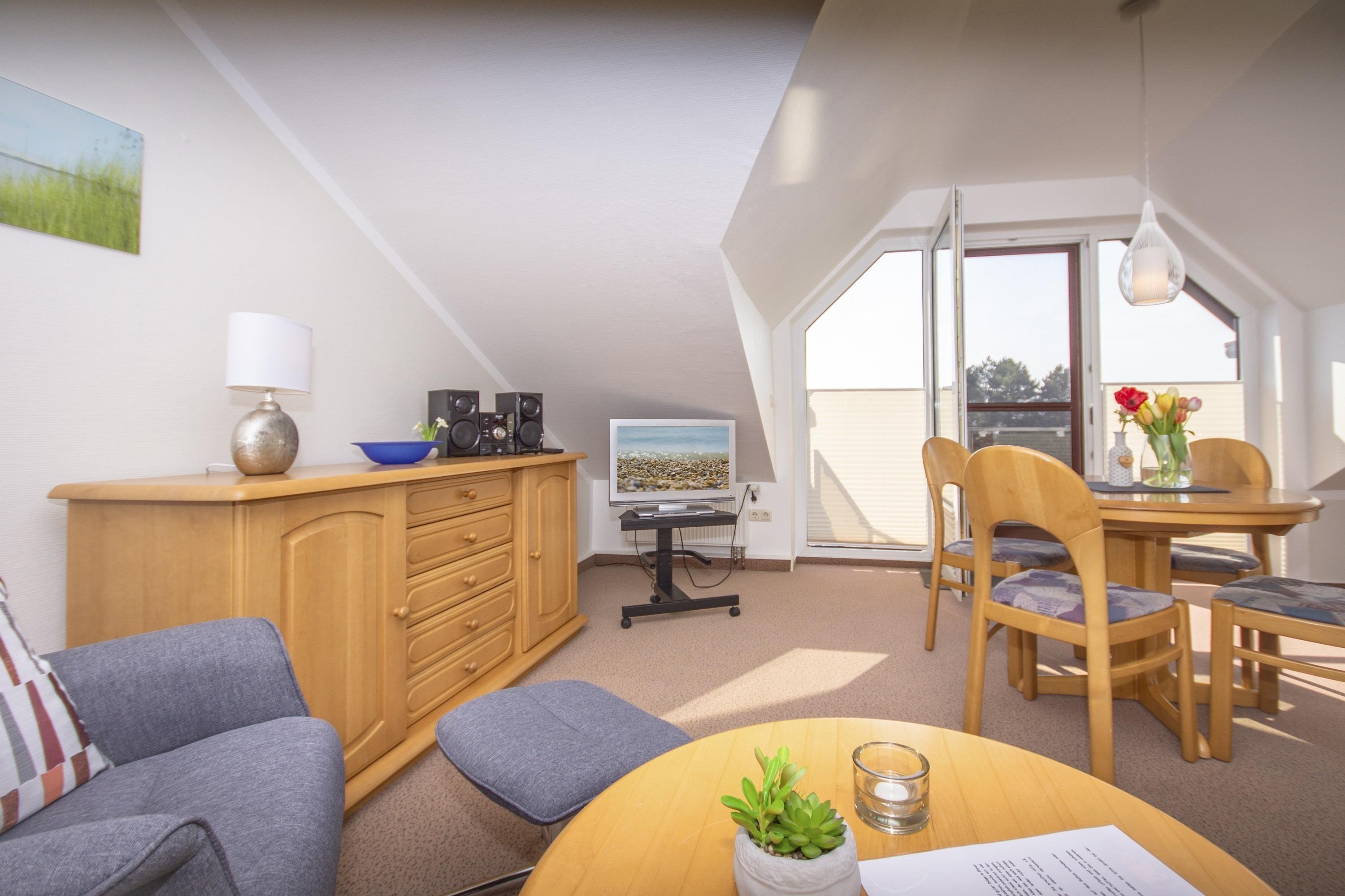 Der freundliche Wohnbereich bietet einen gemütlichen Ort zum Ausklingen der erlebnisreichen Tage auf Rügen. Hier befindet sich neben einem modernen Flachbild-TV auch eine außerordentlich komfortable Couchgarnitur, die eine optionale Aufbettung für bis zu 2 weitere Personen darstellt. Von diesem Zimmer erhalten Sie einen direkten Zugang auf den Balkon, welcher mit komfortablen Balkonmöbeln ausgestattet ist. Hier können Sie nach einem erlebnisreichen Strandtag in Baabe einfach mal die Seele baumeln lassen.