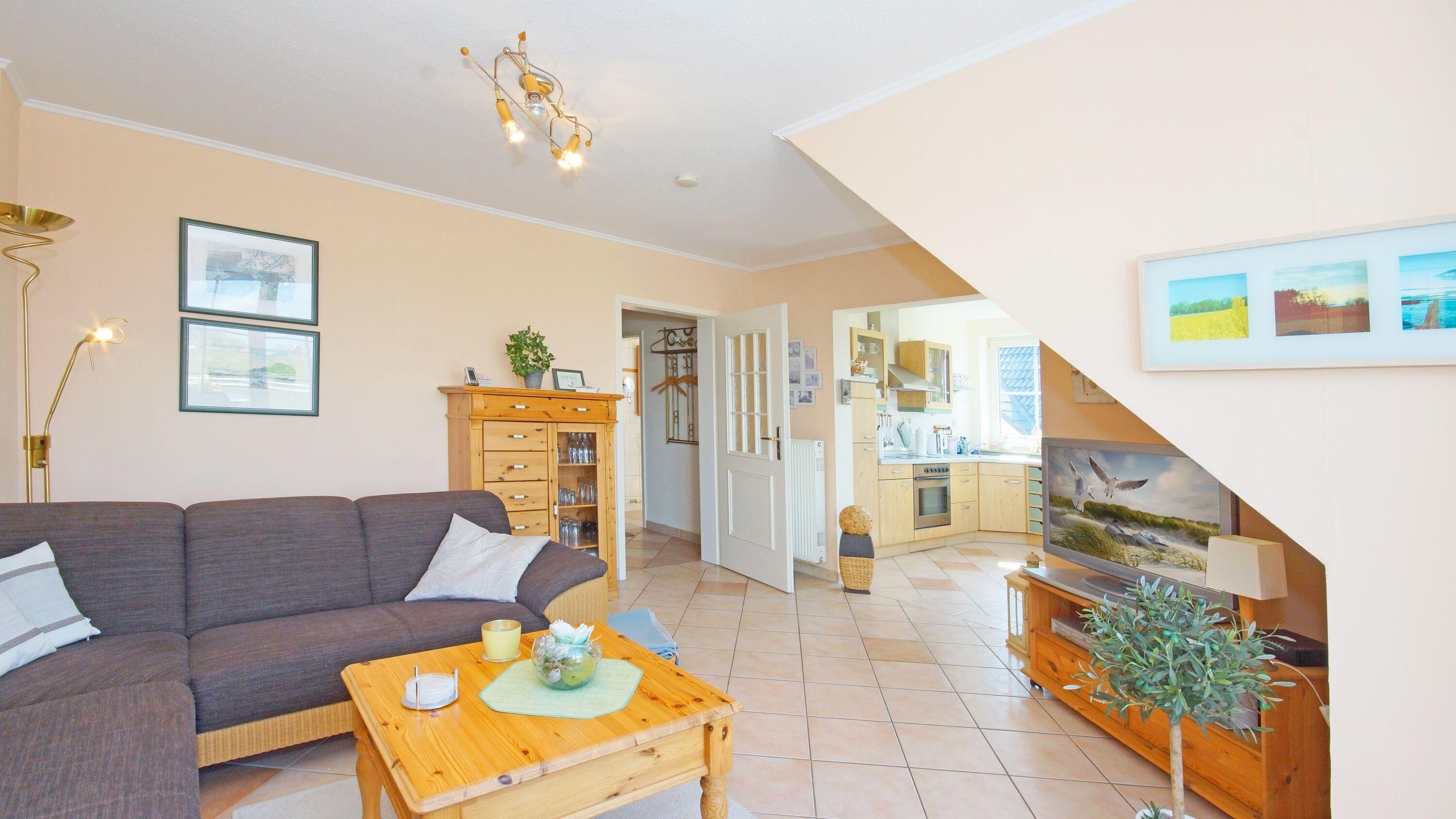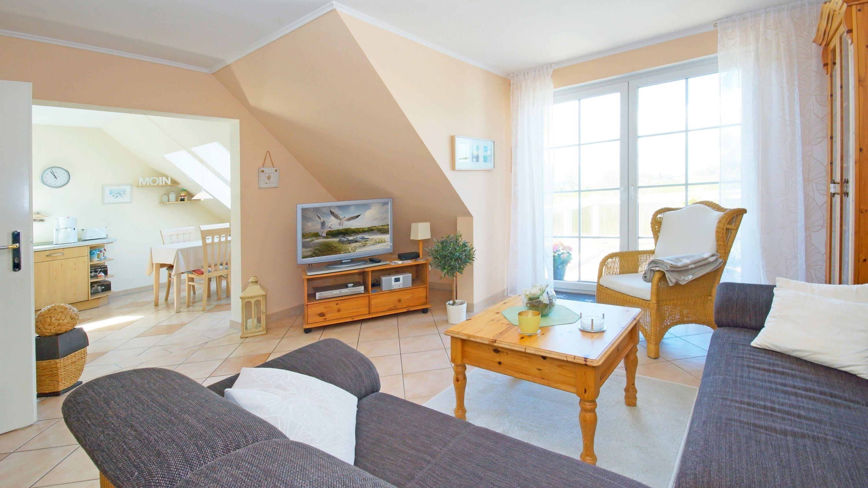 Das Wohnzimmer bietet außer Gemütlichkeit einen Fernseher mit Kabelanschluss, einen DVD-Player, Radio, CD-Player und W-Lan-Anschluss.
