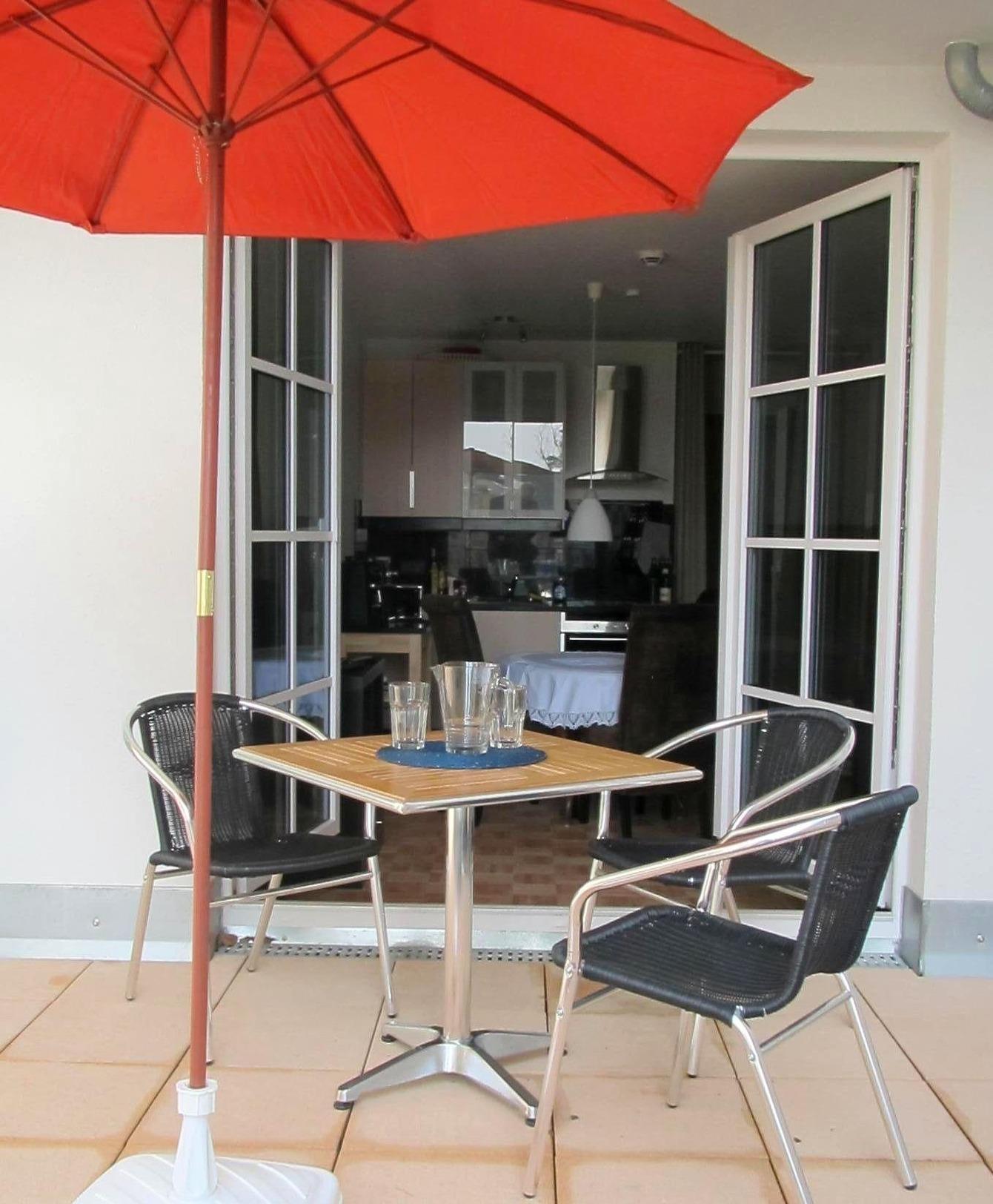 Die komfortable Ferienwohnung mit 2 Zimmer ca. 40 qm mit moderner Küche (voll ausgestattet- Herd, Backofen, Spülmaschine, Espressomaschine usw.), Wohnbereich mit Flachbildschirm, Musikanlage, WLAN usw., modernem Duschbad und möbliertem Südbalkon mit Strandkorb liegt im Apartmenthaus 'Meeresblick', direkt auf der Düne.