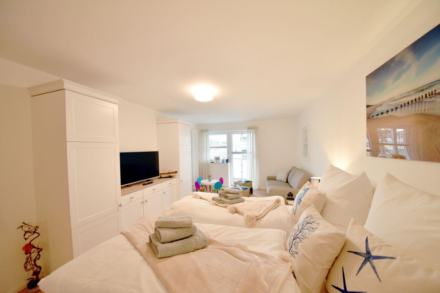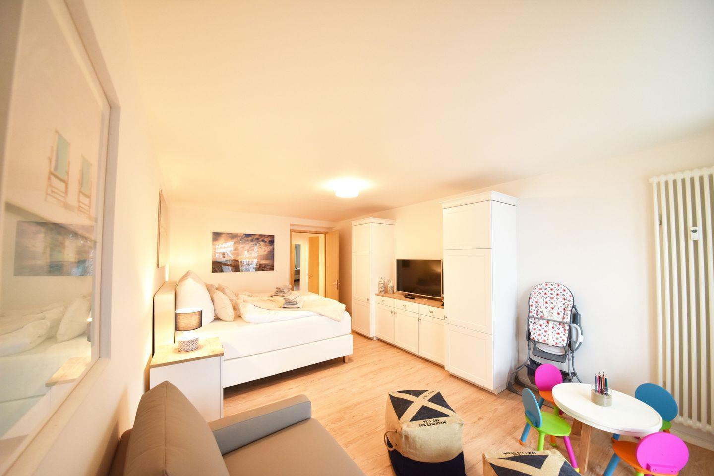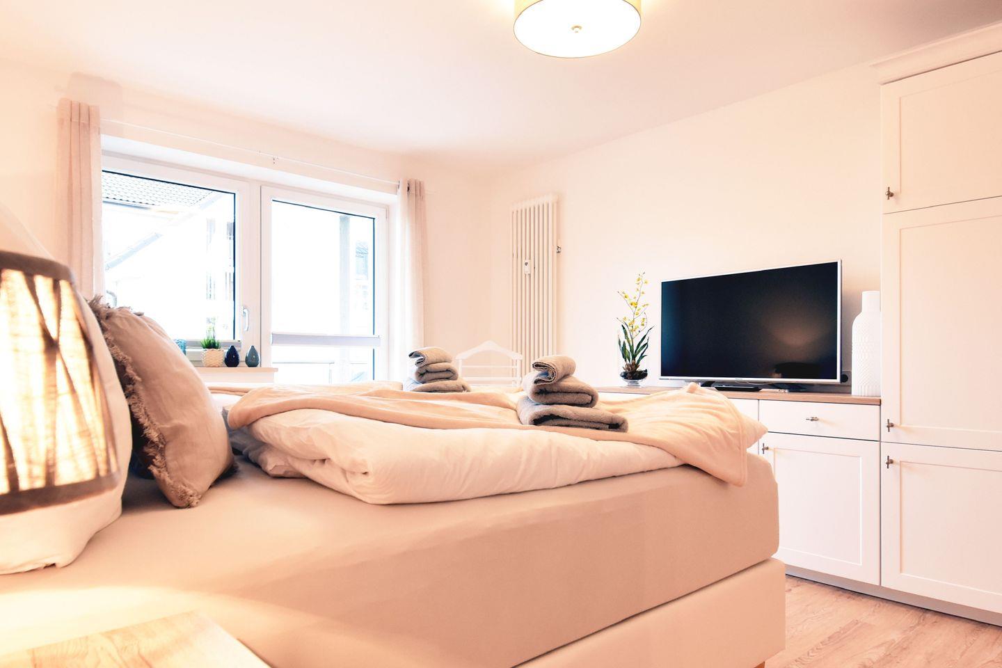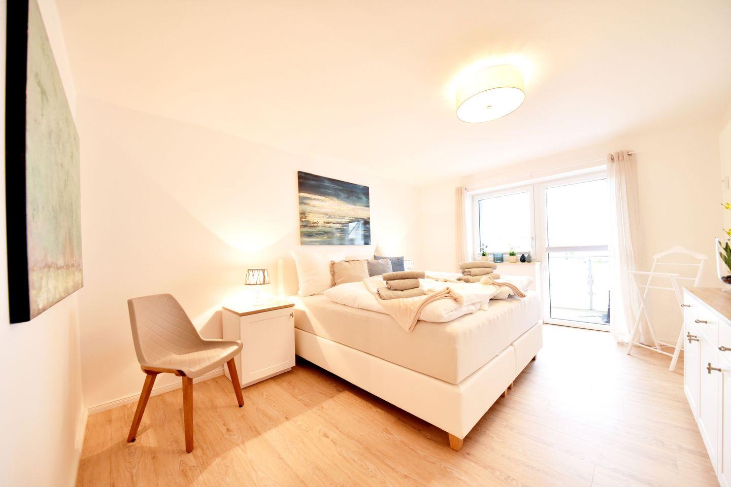 Die beiden großen Schlafzimmer der Ferienwohnung "Traumdüne" sind mit bequemen Boxspringbetten (180x200m), Nachttischen, Kleiderschränken, Herrendiener und Smart-TV ausgestattet. Ein Zugang zum Balkon ist ebenfalls durch die Balkonfenster der beiden Schlafzimmer gegeben.