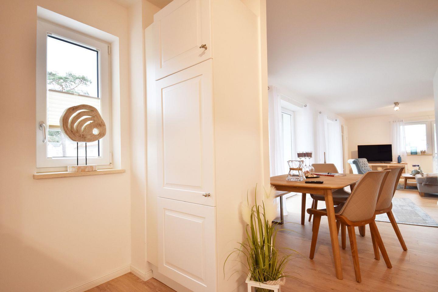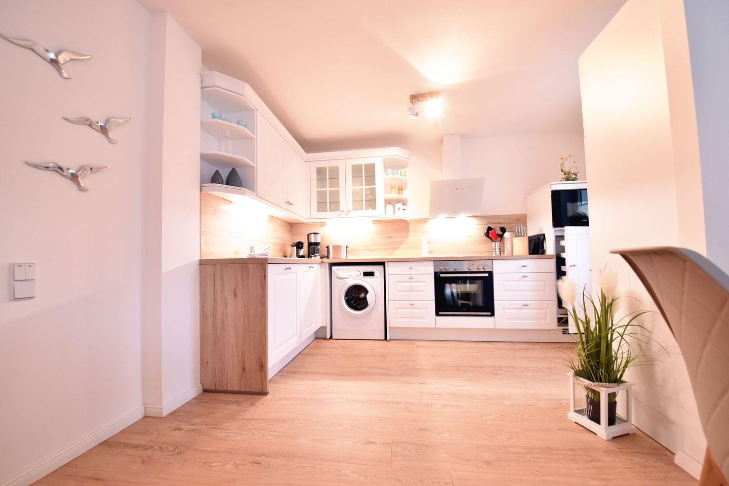 Der Wohnraum beginnt mit einer großen Eckküche, die überaus gut ausgestattet ist und zu geselligen Kochabenden mit der Familie einlädt. Für Frühstück, Mittag und Abendbrot ist die Ausstattung der Küche ideal ausgelegt. Auch Backzubehör ist vorhanden. An Elektrogeräten findet der Gast hier neben Geschirrspüler, Waschmaschine, Backofen und Kühlschrank mit Gefrierfach auch Kleingeräte wie Wasserkocher, Kapselmaschine für Kapseln der Marke Nespresso, Filterkaffeemaschine, Toaster und Rührbesen sowie eine Mikrowelle. Auch ein Radio steht in der Küche bereit.