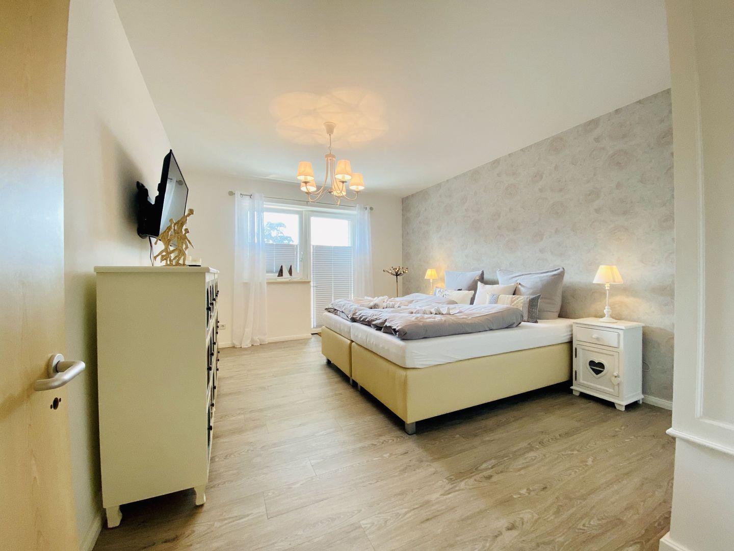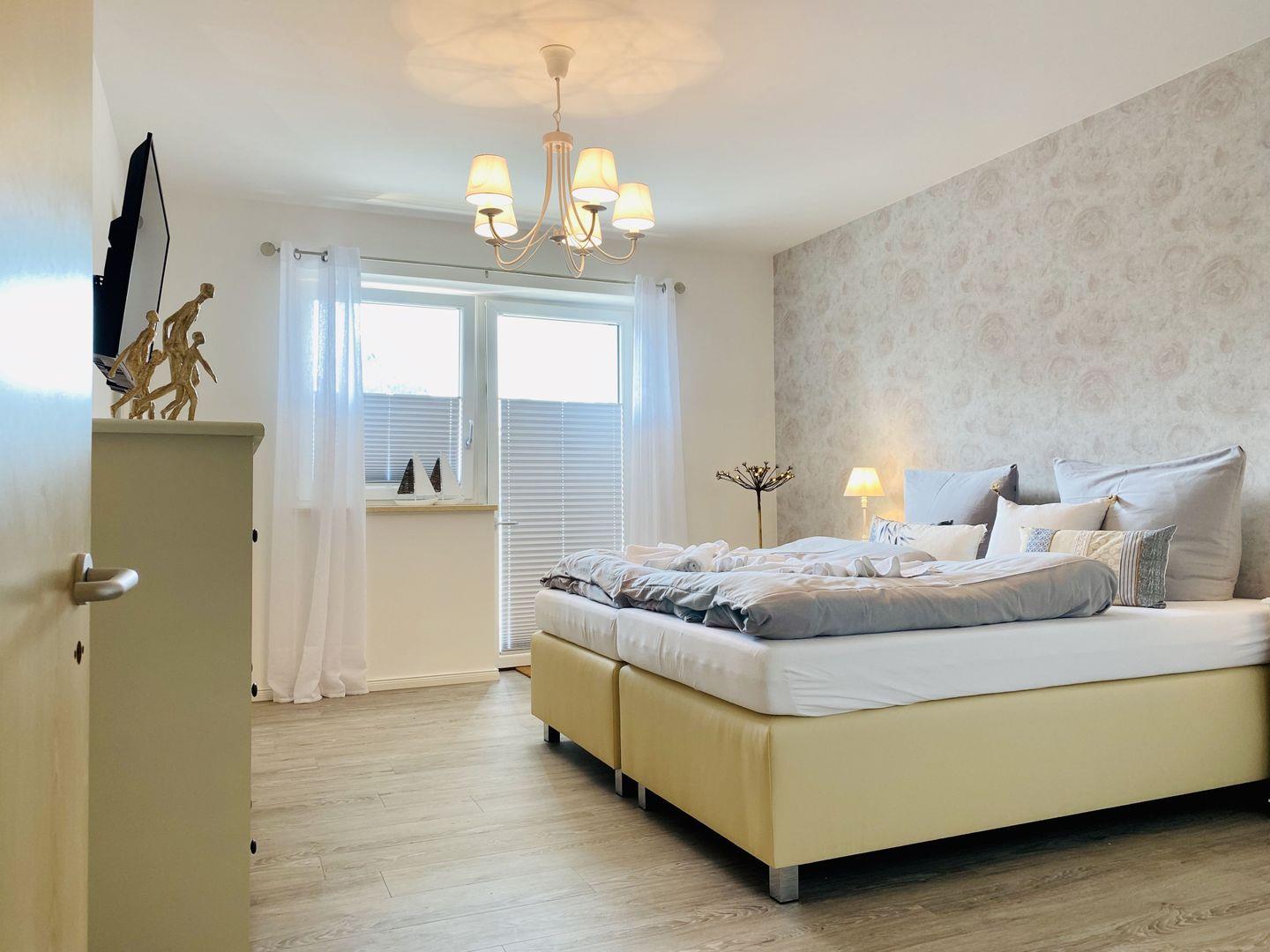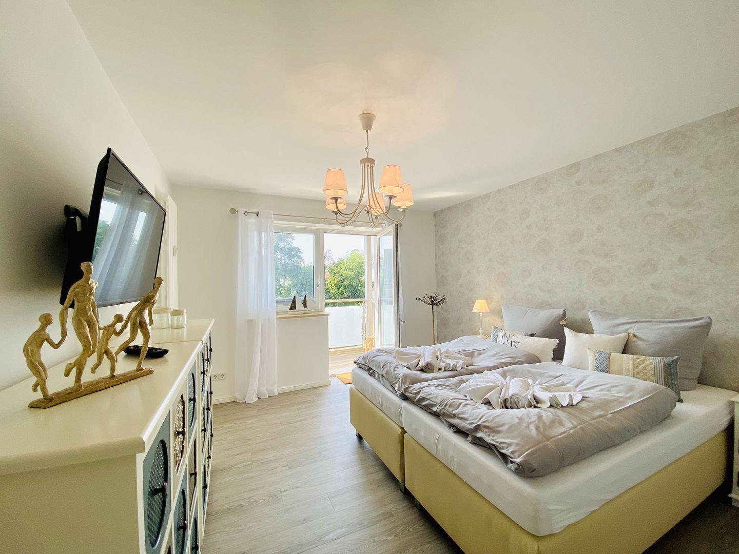 Die beiden großen Schlafzimmer der Ferienwohnung "Weltenbummler" sind mit bequemen Boxspringbetten (180x200m), Nachttischen, Kleiderschrank oder Kommode, Ablagemöglichkeit und Smart-TV ausgestattet. Ein Zugang zum Balkon ist ebenfalls durch die Balkonfenster der beiden Schlafzimmer gegeben.