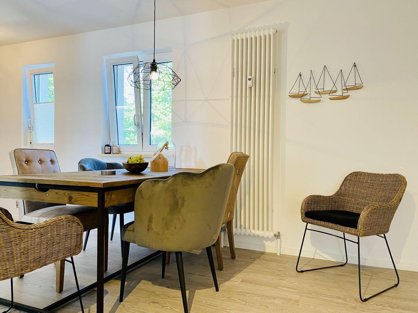 Der Esstisch ist aus Holz und bietet genügend Platz für bis zu 6 Personen. Von hieraus kann man das Wohnzimmer betreten, welches mit chilligem Sessel, Schaukelstuhl, Couch, Tripodlampe, Sideboard und großem Flachbild TV zu schönen Abenden einlädt.