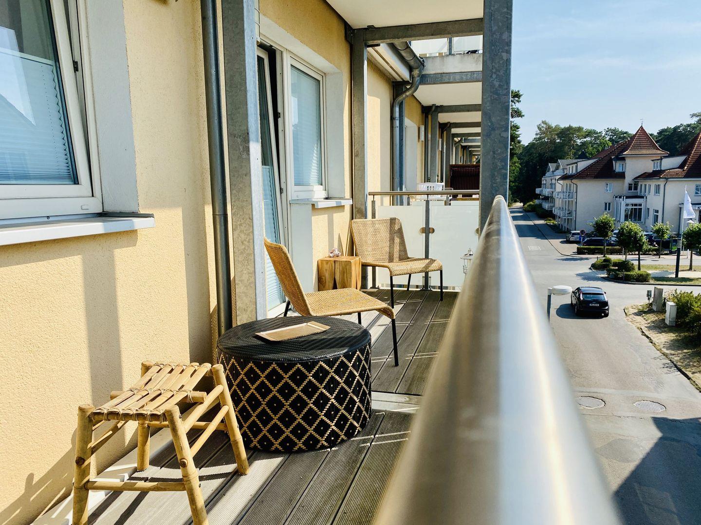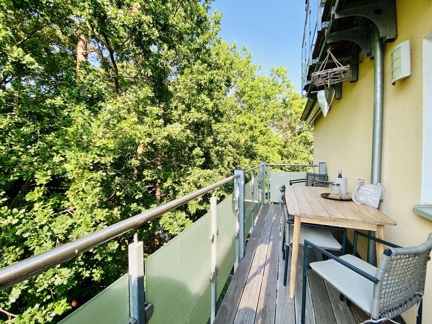 Die Ferienwohnung "Weltenbummler" bietet tolle Außensitzflächen auf 2 an die Wohn- und Schlafräume grenzenden Balkonen. Auf dem Schlafzimmerbalkon ist der Blick entlang der schönen Villen von Baabe ein absolutes Highlight. Balkonmöbel mit schönen, bequemen Sitzkissen laden zu sonnigen Urlaubsstunden mit Ausblick und Ruhe ein.