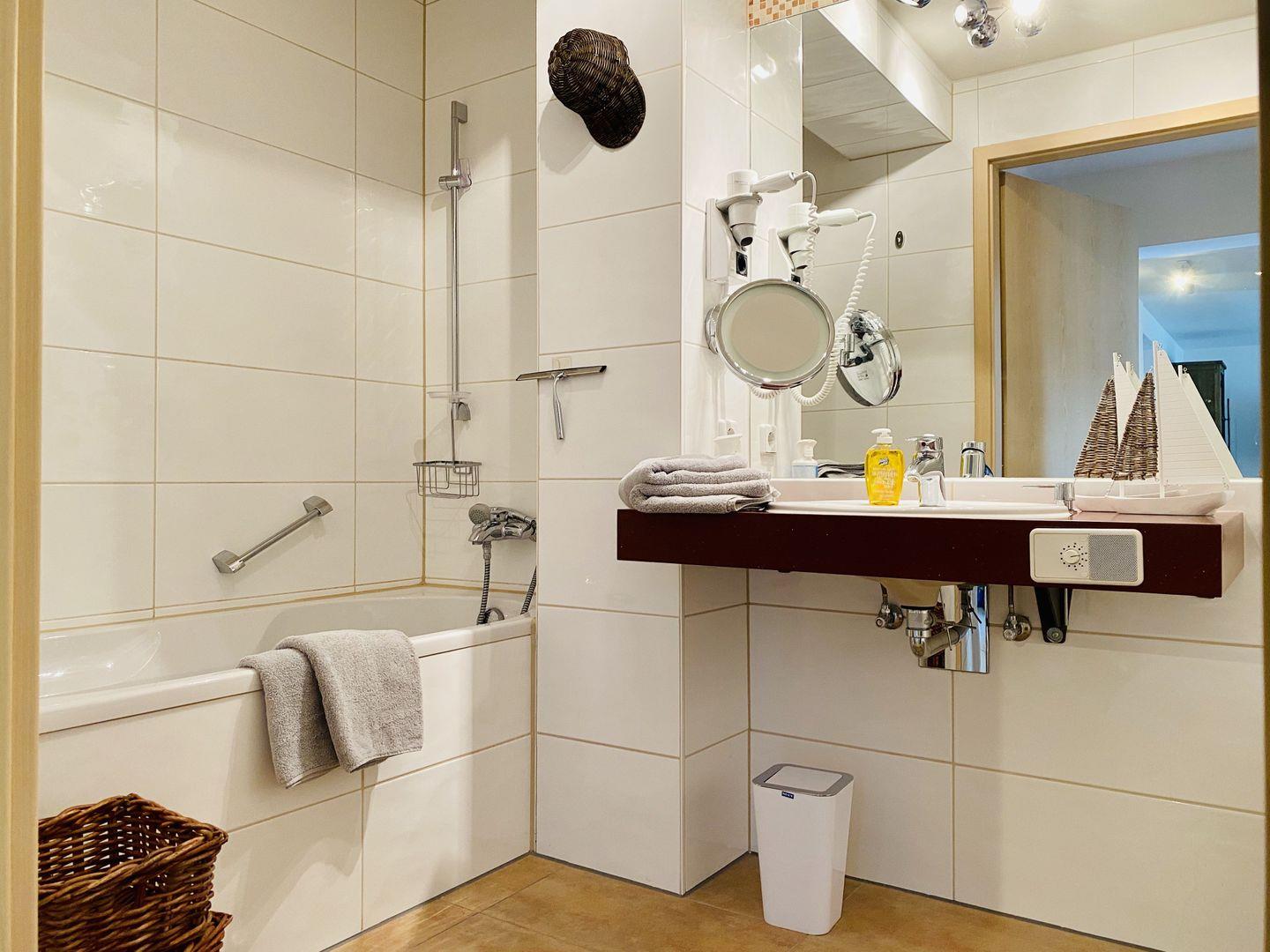 Das Badezimmer hat eine Badewanne mit inkludierter Duschbrause, einen Waschtisch, einen großen Handtuchwärmer, genügend Ablagefläche für die mitgebrachten Kosmetikartikel und ein WC. Fön, Kosmetikspiegel und Seifenspender gehören ebenso zur Ausstattung.