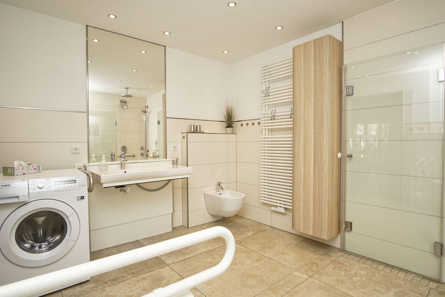 BAD // Badezimmer mit Tageslicht, bodengleiche Dusche mit Sitz und Griffen, Schwalldusche, Kneipschlauch, behinderten gerechtes Lang-WC mit 2 Stützen, unterfahrbarer und elektrisch höhenverstellbarer Waschtisch mit einer Stütze, Bidet ++