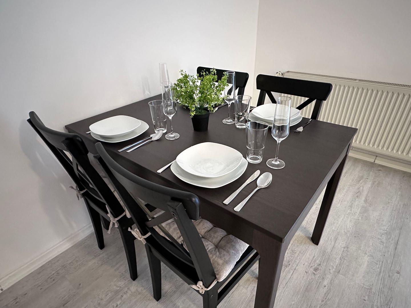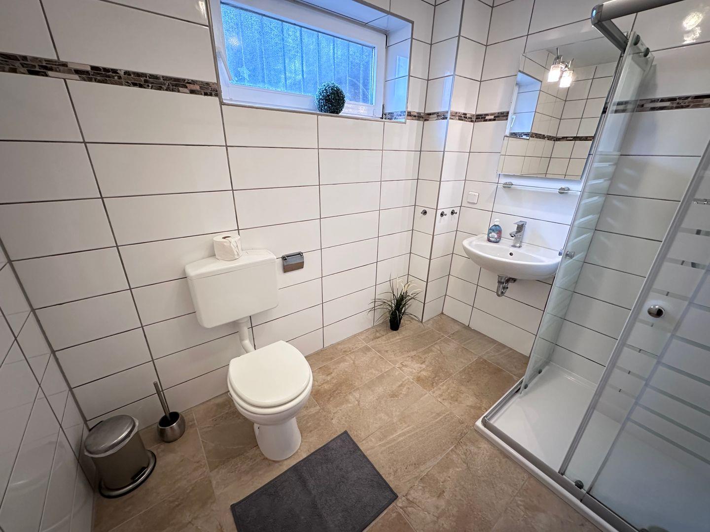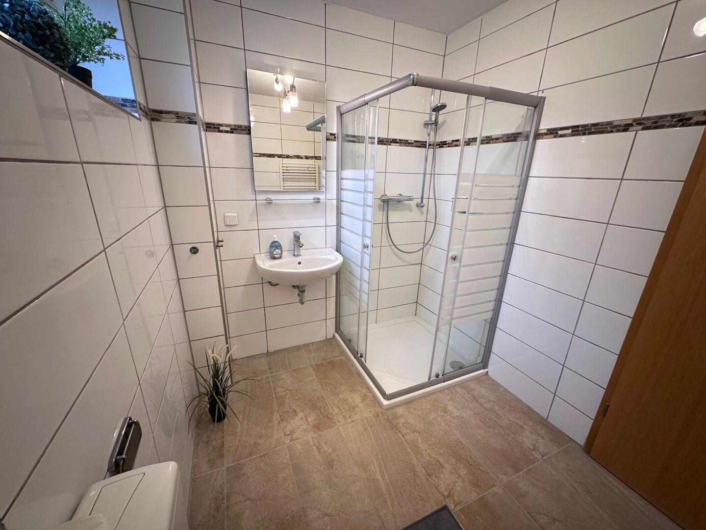 Ein modernes Badezimmer mit Dusche, Waschbecken und WC sorgt für den nötigen Komfort während Ihres Aufenthalts. Selbstverständlich erhalten Sie bei Anreise frische Bettwäsche und Handtücher, sodass Sie direkt in Ihren Urlaub starten können. Die Wohnung ist zudem eine Nichtraucherunterkunft und liegt in einem ruhigen, abgeschlossenen Grundstück, das für zusätzliche Privatsphäre sorgt.