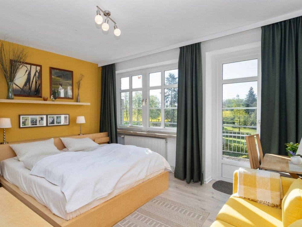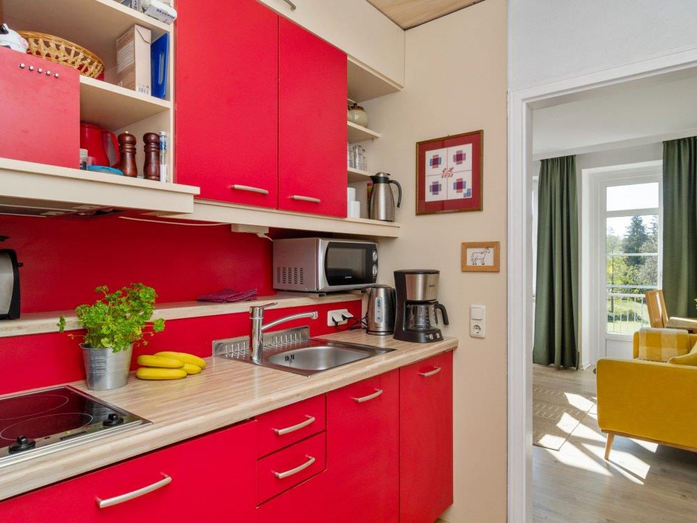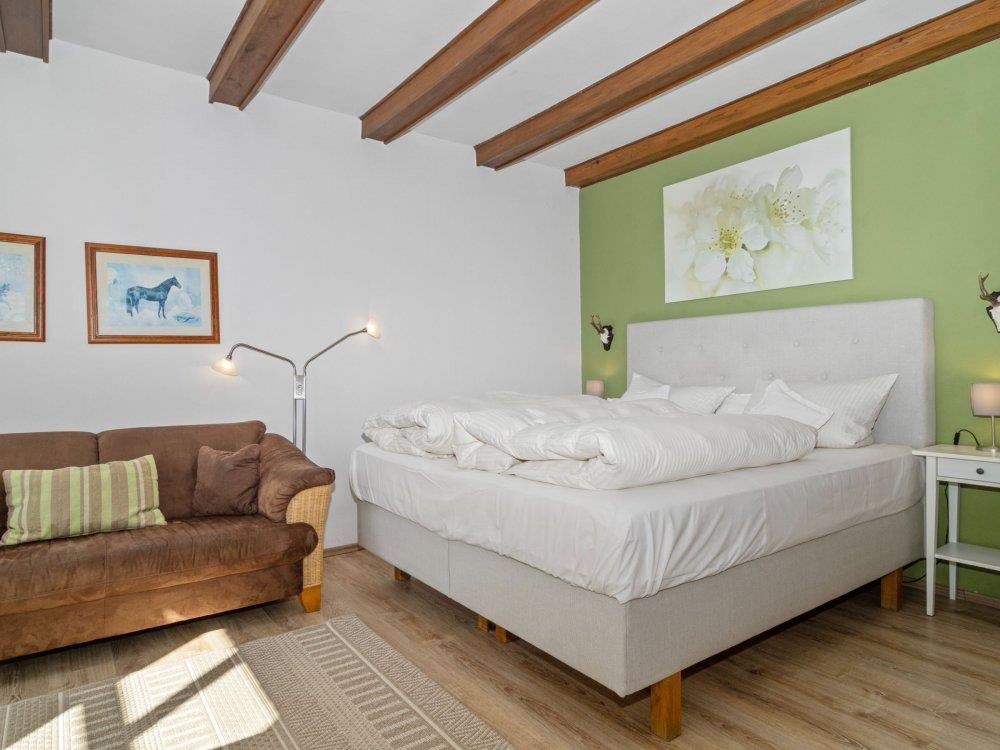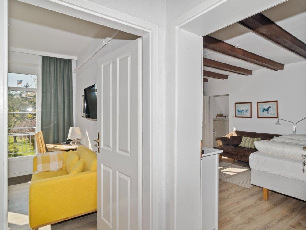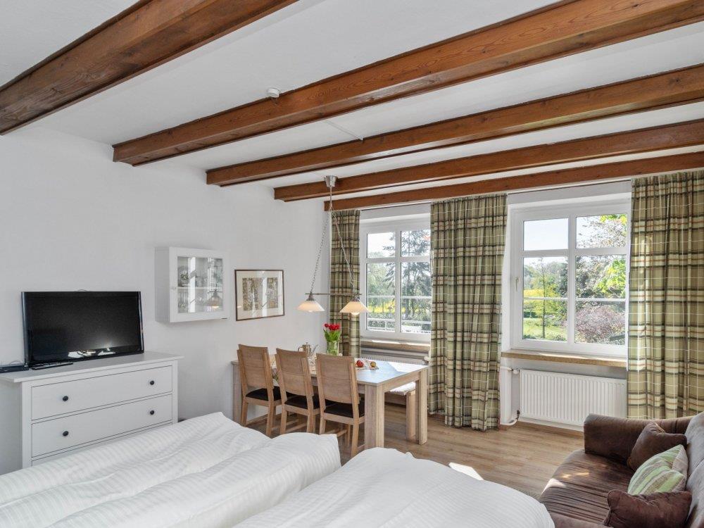 Diese gemütliche ?Familieneinheit? befindet sich im großen Bauernhaus und bietet viel Platz für einen entspannten Urlaub. Sie verfügt über eine voll ausgestattete Küche, zwei separate Schlafzimmer mit jeweils Sofa und TV sowie ein eigenes Badezimmer mit Dusche und WC. Ein Tisch in den Räumen lädt zum Essen, Spielen oder Arbeiten ein.Vom Balkon oder den Fenstern aus genießen Sie den Blick auf die umliegenden Felder und den Bauerngarten ? ideal zum Entspannen und die Natur zu genießen. Die Räume sind hell und sonnig, die Sonne scheint hier ab mittags bis in den Nachmittag hinein.