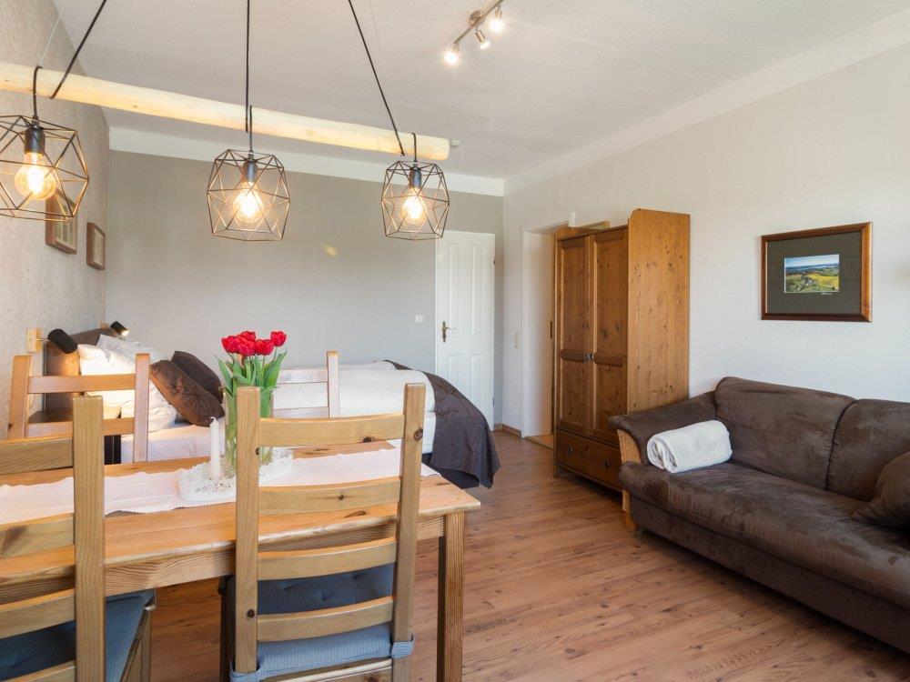 Diese gemütliche ?Familieneinheit? befindet sich im großen Bauernhaus und bietet viel Platz für einen entspannten Urlaub. Sie verfügt über eine voll ausgestattete Küche, zwei separate Schlafzimmer mit jeweils Sofa und TV sowie ein eigenes Badezimmer mit Dusche und WC. Ein Tisch in den Räumen lädt zum Essen, Spielen oder Arbeiten ein.Vom Balkon oder den Fenstern aus genießen Sie den Blick auf die umliegenden Felder und den Bauerngarten ? ideal zum Entspannen und die Natur zu genießen. Die Räume sind hell und sonnig, die Sonne scheint hier ab mittags bis in den Nachmittag hinein.