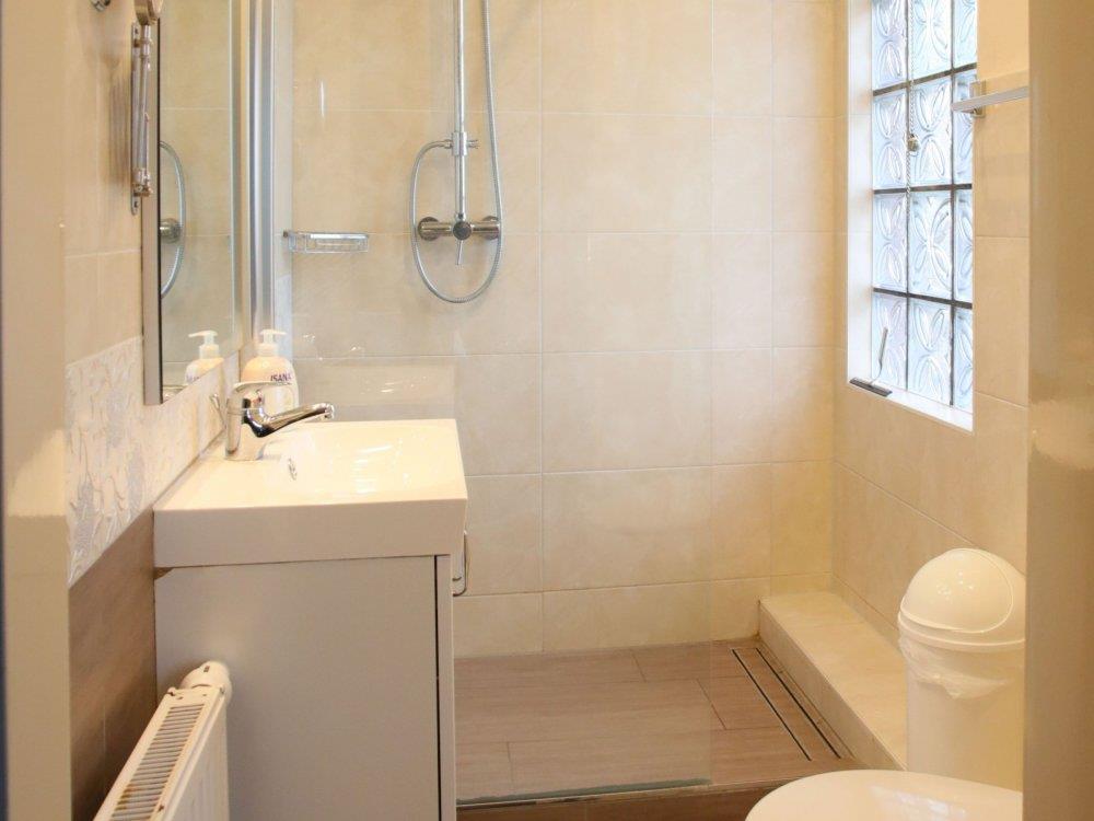 Badezimmer mit Fenster, Dusche, Handtuchtrockner, WC, WC und Dusche