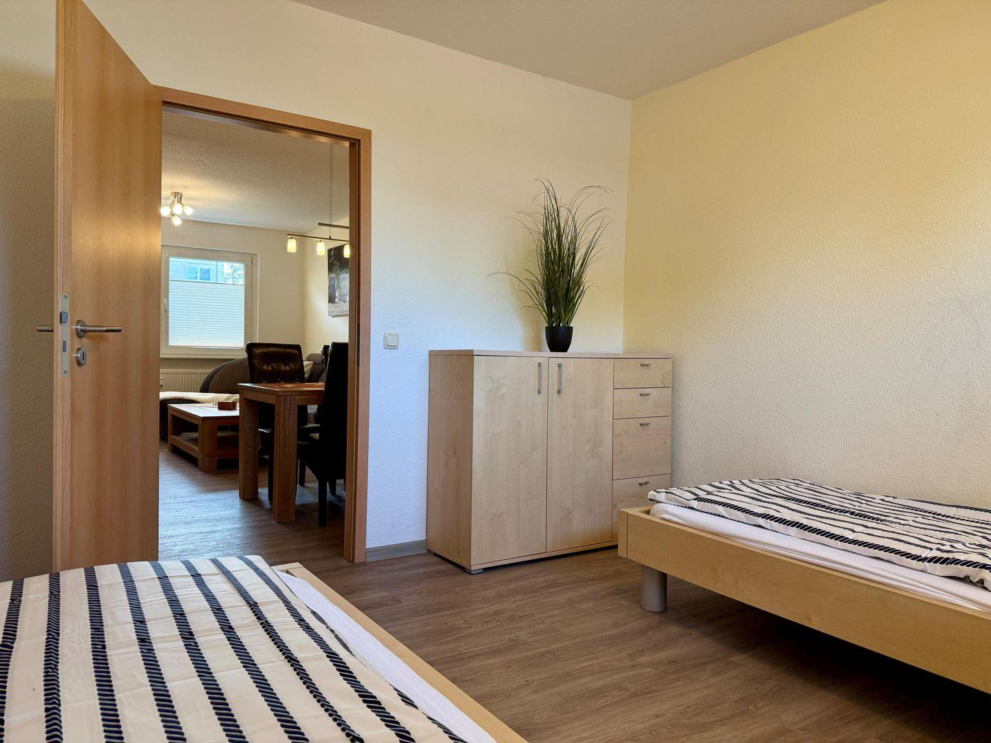 Die großzügig geschnittene Wohnung verfügt über zwei separate Schlafzimmer. Ausschließlich hochwertige Bettwäsche sowie Handtücher stehen für Sie bereit. Im lichtdurchfluteten Wohnzimmer erwartet Sie eine gemütliche Sofaecke, in der Sie nach einem erlebnisreichen Tag entspannen können. Ein TV, kostenloses WLAN und ein einladender Essbereich tragen zur Erholung und Unterhaltung während Ihres Aufenthaltes bei. Für Familien ist die Ferienwohnung ebenfalls bestens geeignet; entsprechende Annehmlichkeiten wie ein Esstisch, eine Garderobe und Sichtschutz an allen Fenstern bieten ein hohes Maß an Alltagstauglichkeit und Privatsphäre.