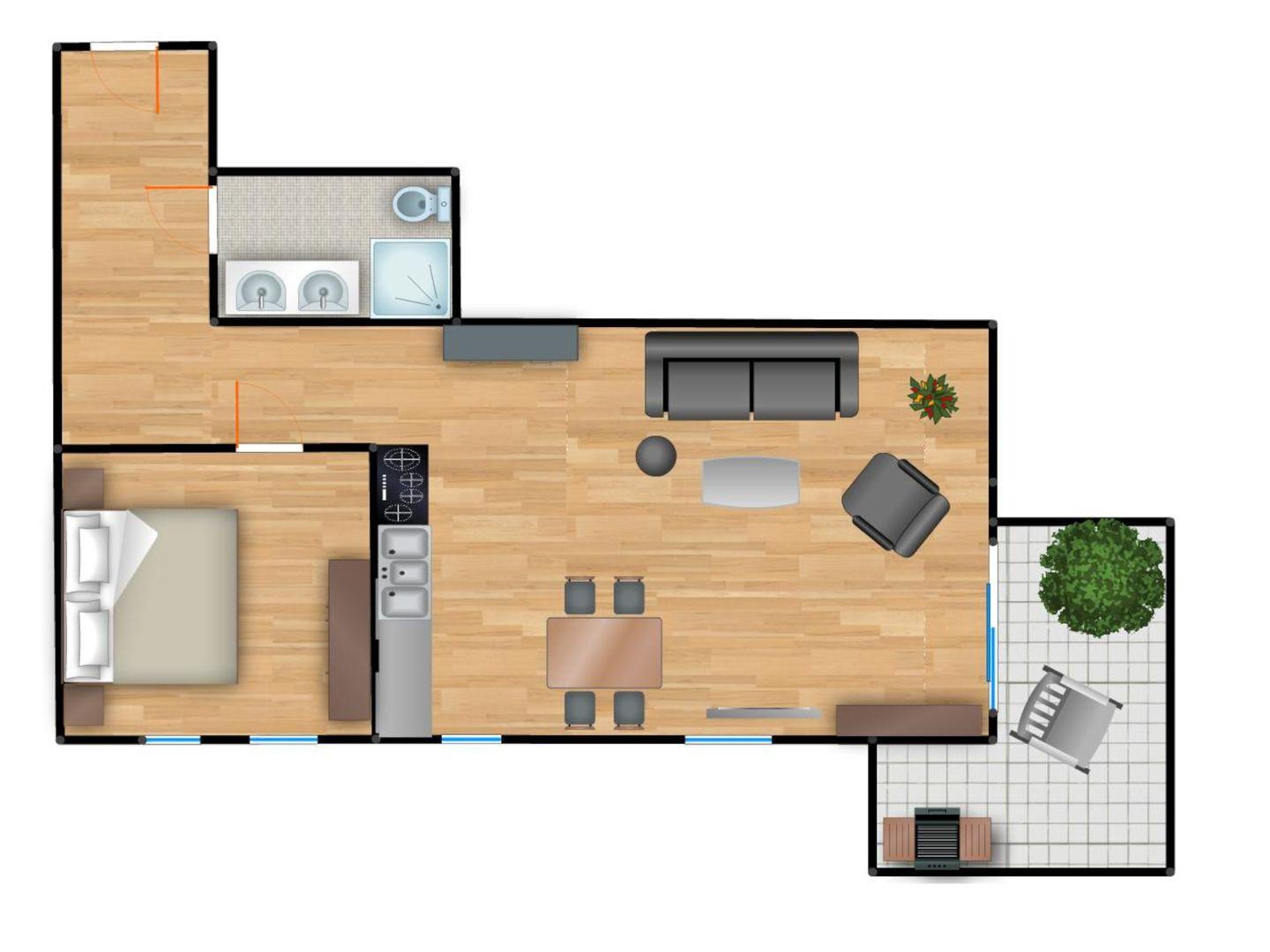 Die 58m² bieten ein gemütliches Schlafzimmer und eine moderne Einbauküche mit Geschirrspüler und Mikrowelle. Die Erdgeschoss-Terrasse macht die Wohnung ideal für Paare.
