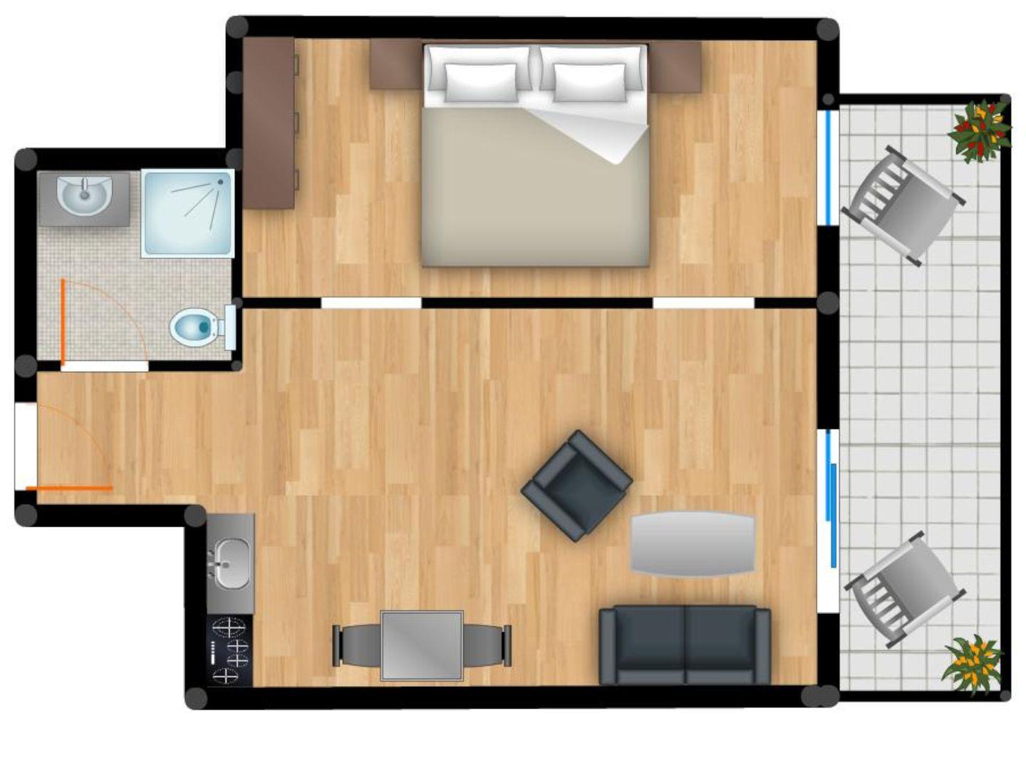 Die durchdachte Raumaufteilung der Wohnung (Schlafzimmer, Wohnbereich mit integrierter Küche und Bad) ermöglicht einen perfekten Rückzugsort für zwei Personen und ein kleines Kind.