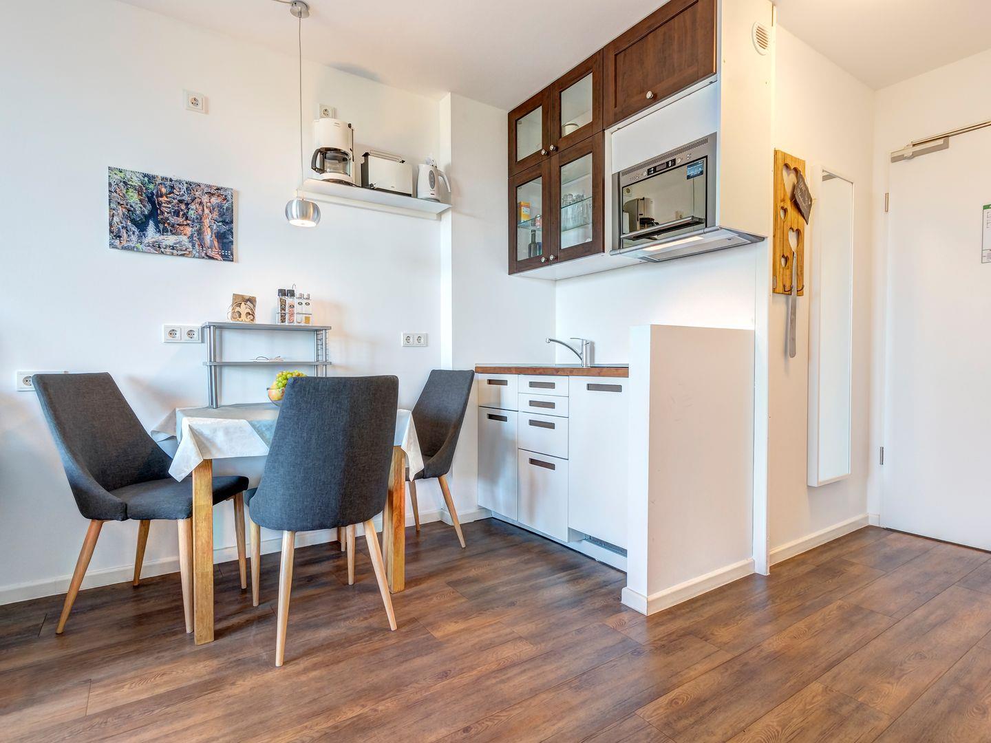 Die durchdachte Raumaufteilung der Wohnung ermöglicht einen perfekten Rückzugsort für zwei Personen und ein kleines Kind. Das vollwertige Schlafzimmer lädt zum Träumen ein, während der offene Wohnbereich mit moderner Küche eine gemütliche Atmosphäre schafft. Das stilvolle Badezimmer rundet das Angebot ab und sorgt für zusätzlichen Komfort während Ihres Aufenthalts.