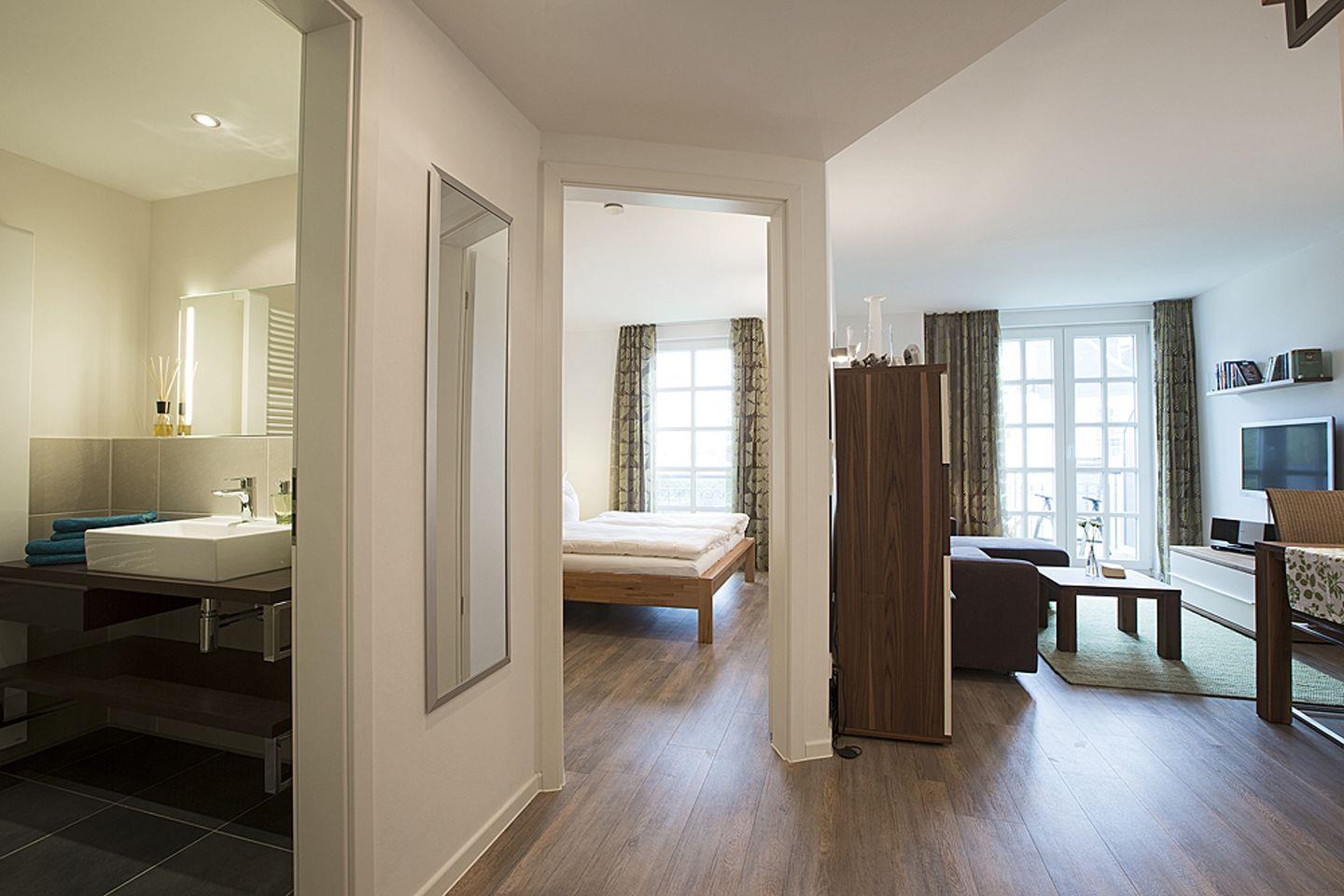 Das moderne Bad trägt ebenfalls zu Ihrem Wohlbefinden bei und rundet das Gesamterlebnis ab. Jeder Tag Ihres Aufenthalts beginnt und endet hier mit Komfort und Stil.