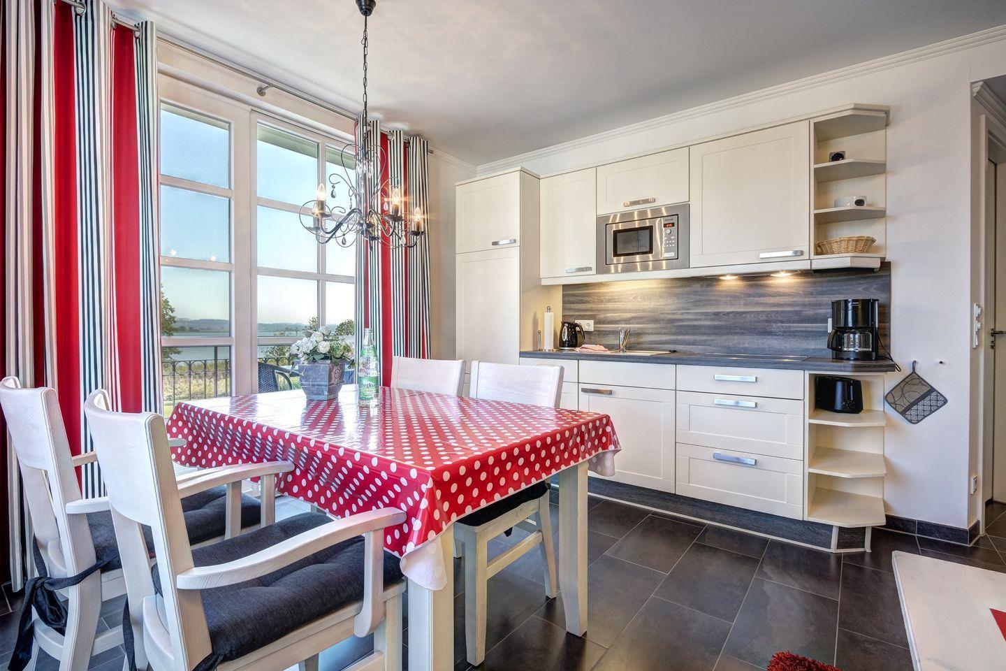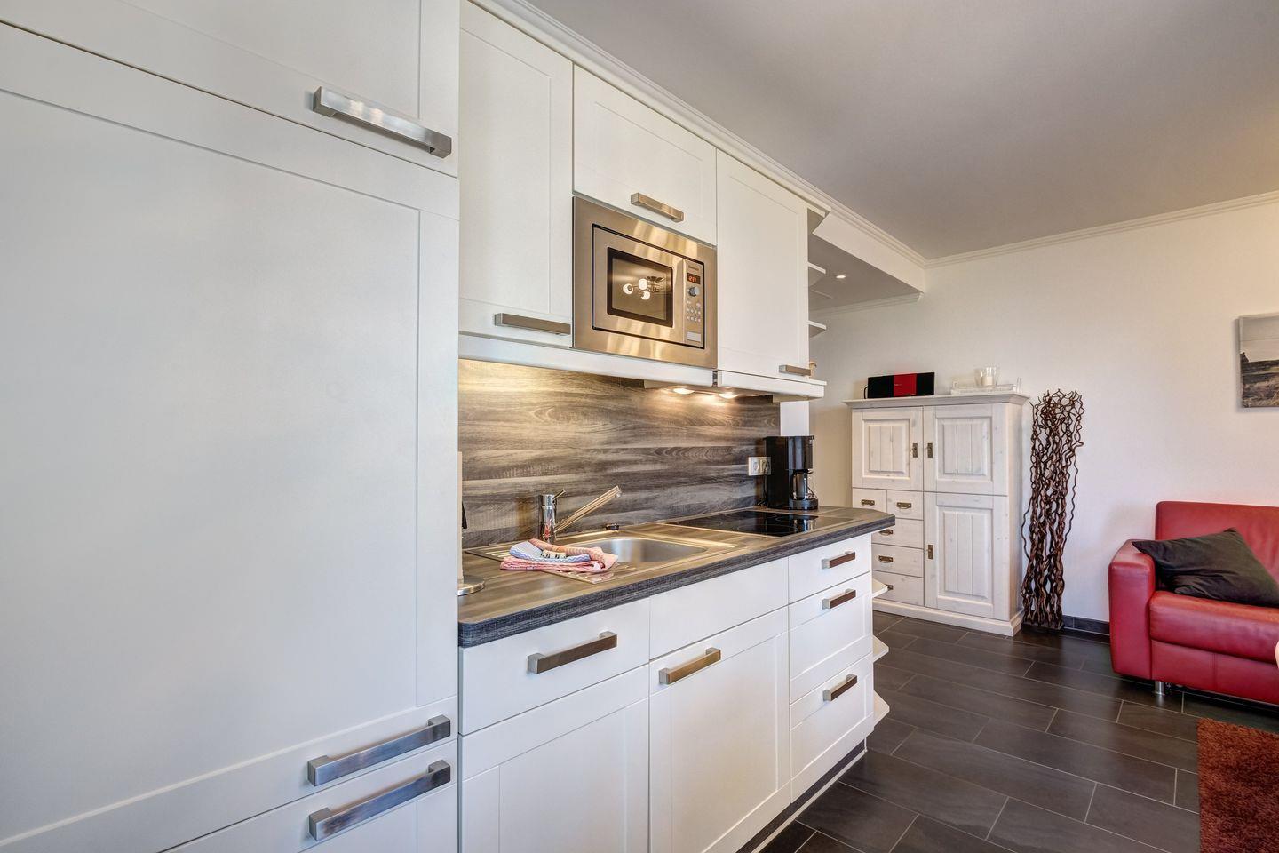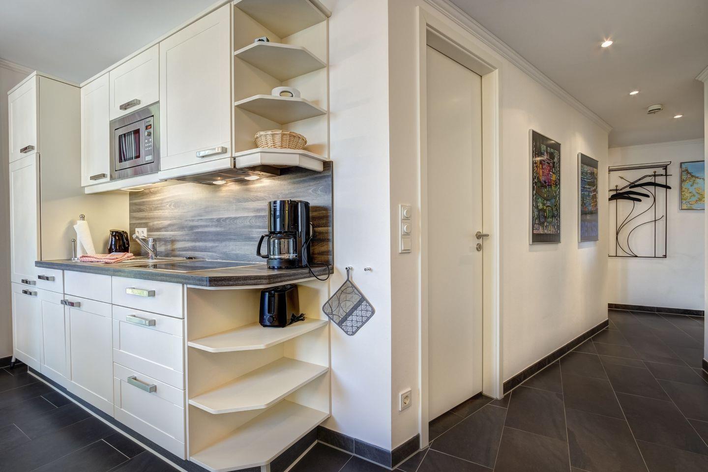 Die Wohnung beinhaltet zudem ein modernes Badezimmer und einen praktischen Abstellraum. Die vollständig eingerichtete Küche mit Geschirrspüler und Mikrowellengerät steht Ihnen für kulinarische Entdeckungen zur Verfügung.