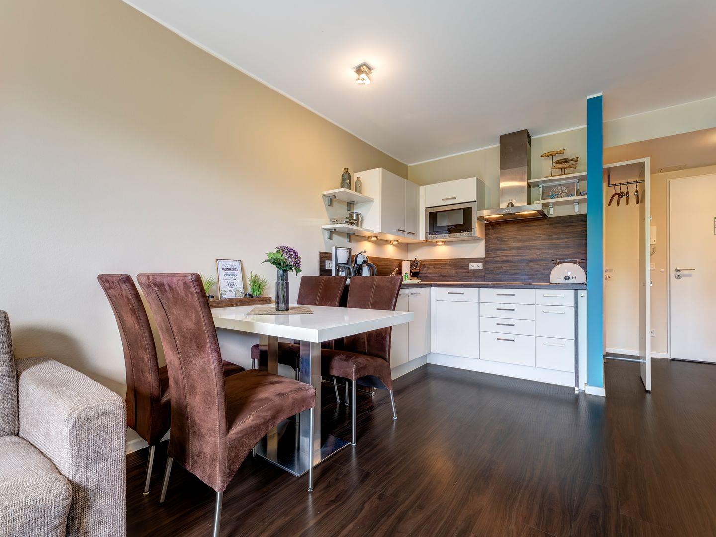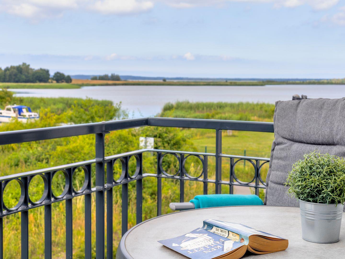 Das vollwertige Schlafzimmer mit einem komfortablen Doppelbett sowie eine hochwertige, leicht ausklappbare Couch garantieren qualitativ gleichwertige Schlafmöglichkeiten für einen erholsamen Schlaf. Der gemütliche Wohn-/Essbereich mit offener Küche sowie der modernen Einrichtung wie z.B. Airfryer, öffnet sich zu einem Balkon, der dank seiner nordwestlichen Ausrichtung ab nachmittags von der Sonne verwöhnt wird. Genießen Sie nach Ihren Ausflügen oder sportlichen Aktivitäten einen idyllischen Blick auf den Fischteich und das Achterwasser bei einem Glas Wein.