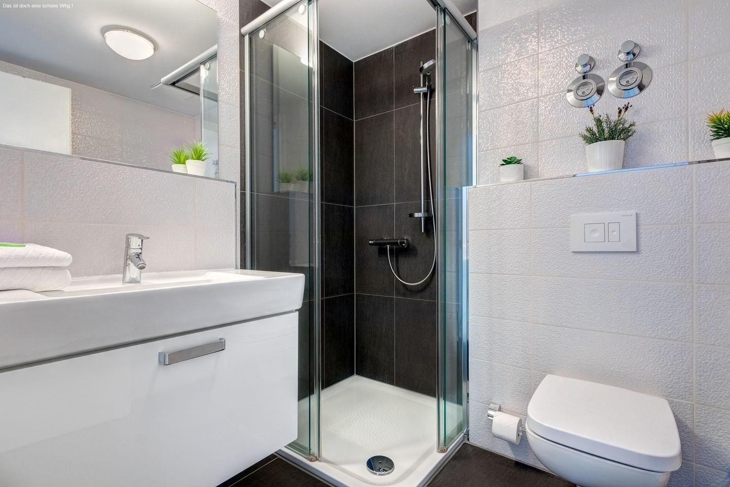 Das moderne Badezimmer bietet nicht nur eine erfrischende Dusche, sondern auch viele komfortable Annehmlichkeiten, die Ihren Aufenthalt noch angenehmer gestalten.