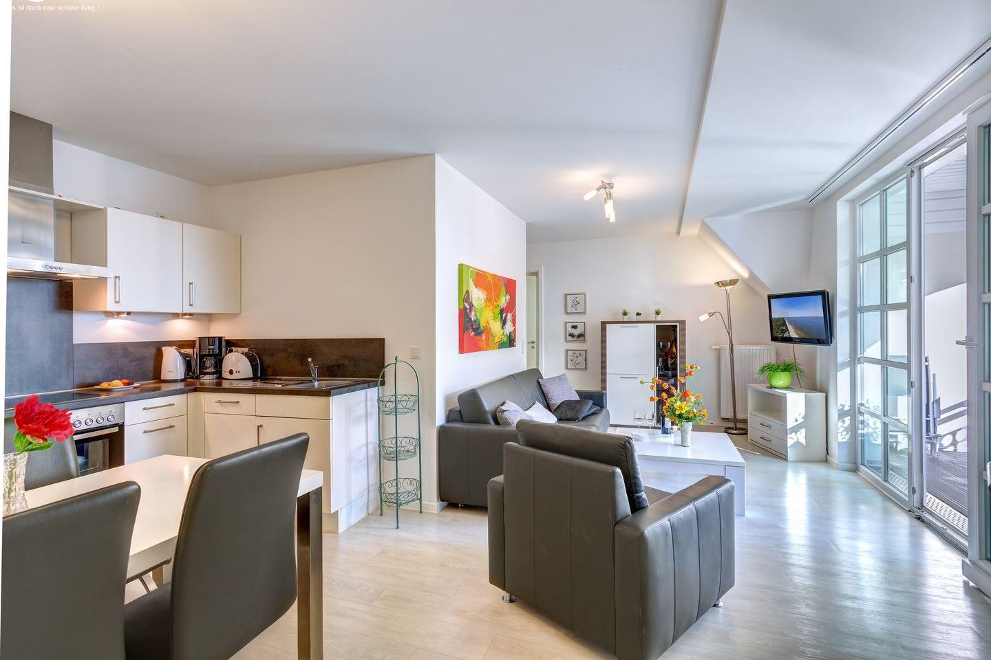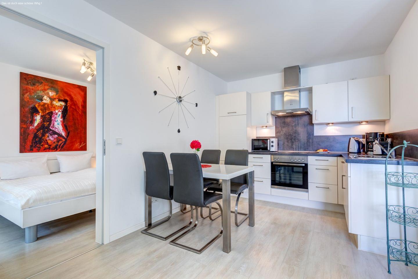 Unsere mit 5 DTV-Sternen zertifizierte Wohnung bietet nicht nur Luxus, sondern auch ausreichend Platz für die ganze Familie. Das großzügige Appartement verfügt über ein geräumiges Wohn- und Esszimmer, sowie zwei vollwertige Schlafzimmer, ausgestattet mit einem komfortablen Doppelbett und einem Schlafsofa.