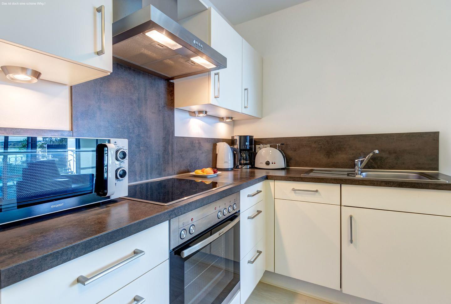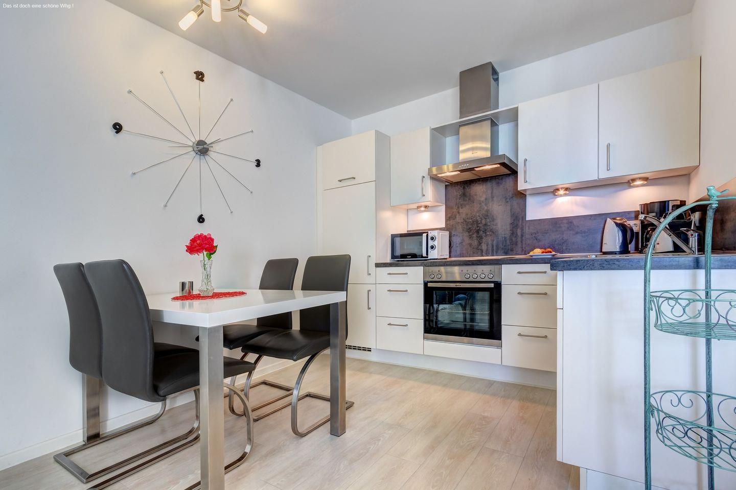 Die hochwertige Küche ist voll ausgestattet und lässt keine Wünsche offen. Kochen Sie Ihre Lieblingsgerichte in einer modernen Umgebung und genießen Sie diese entweder im gemütlichen Essbereich oder auf der Loggia, während Sie die idyllische Aussicht auf das Achterwasser bewundern.