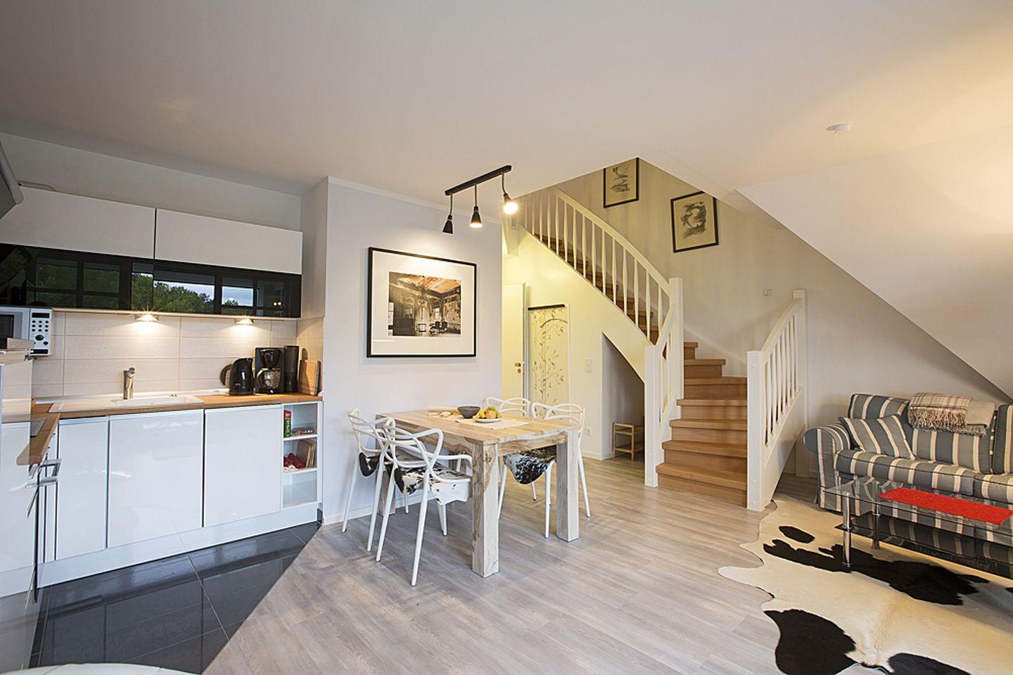 Die hochwertige Küche lädt zum kulinarischen Erlebnis ein und ist vollständig ausgestattet. Am großzügigen Esstisch finden vier Personen bequem Platz, um gemeinsam zu speisen.