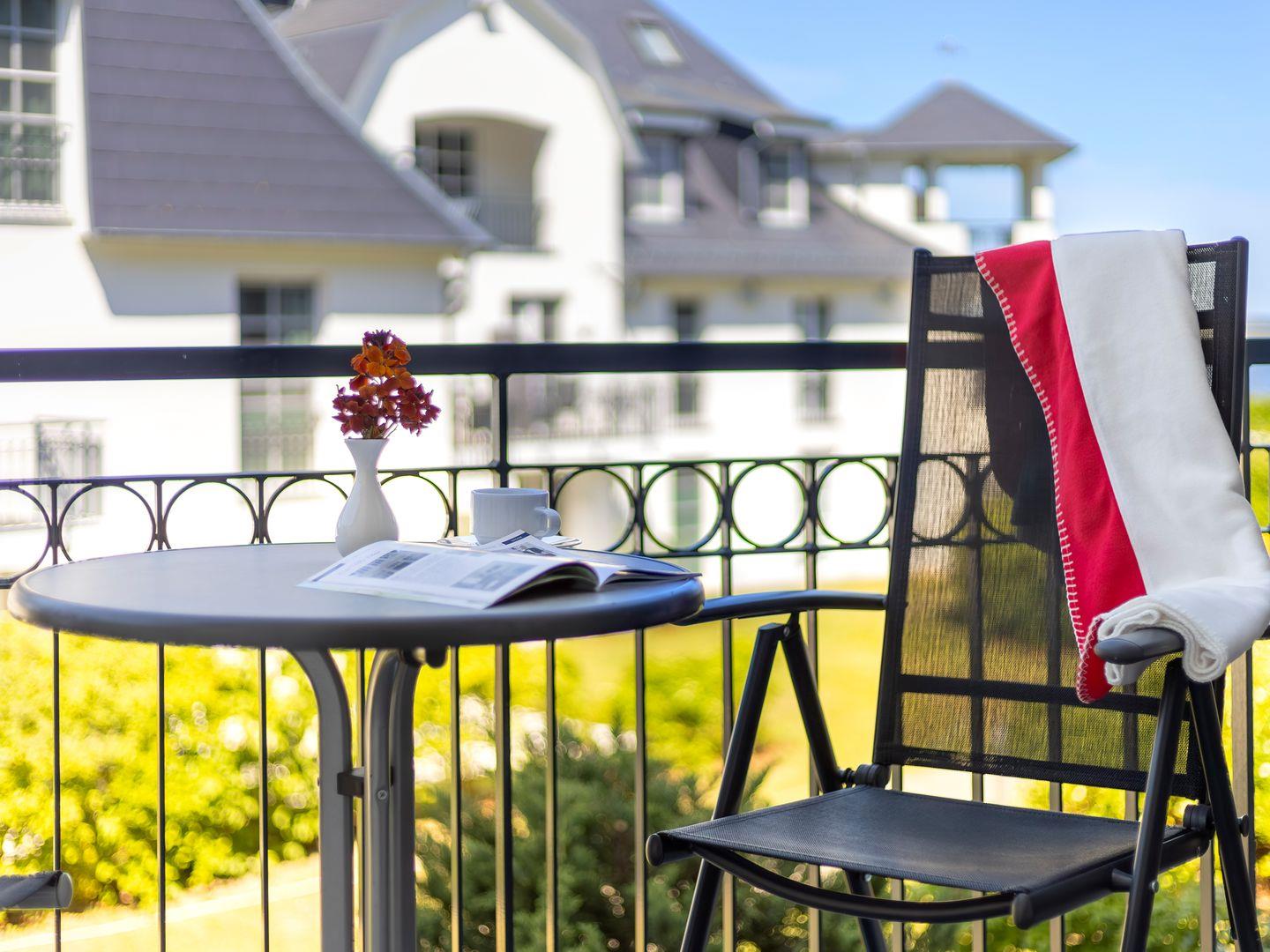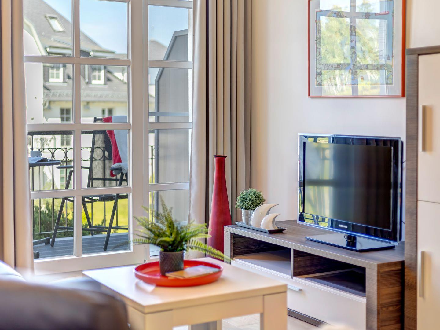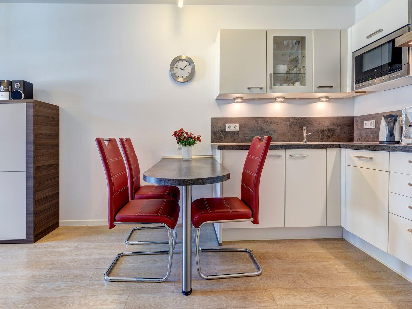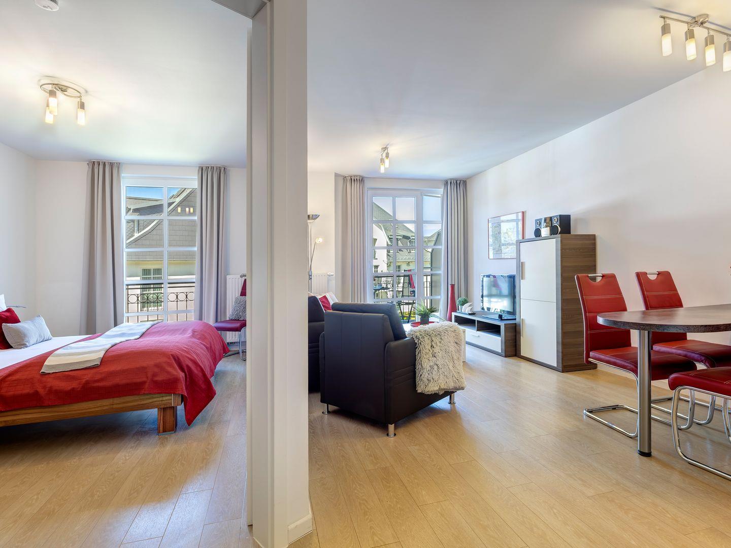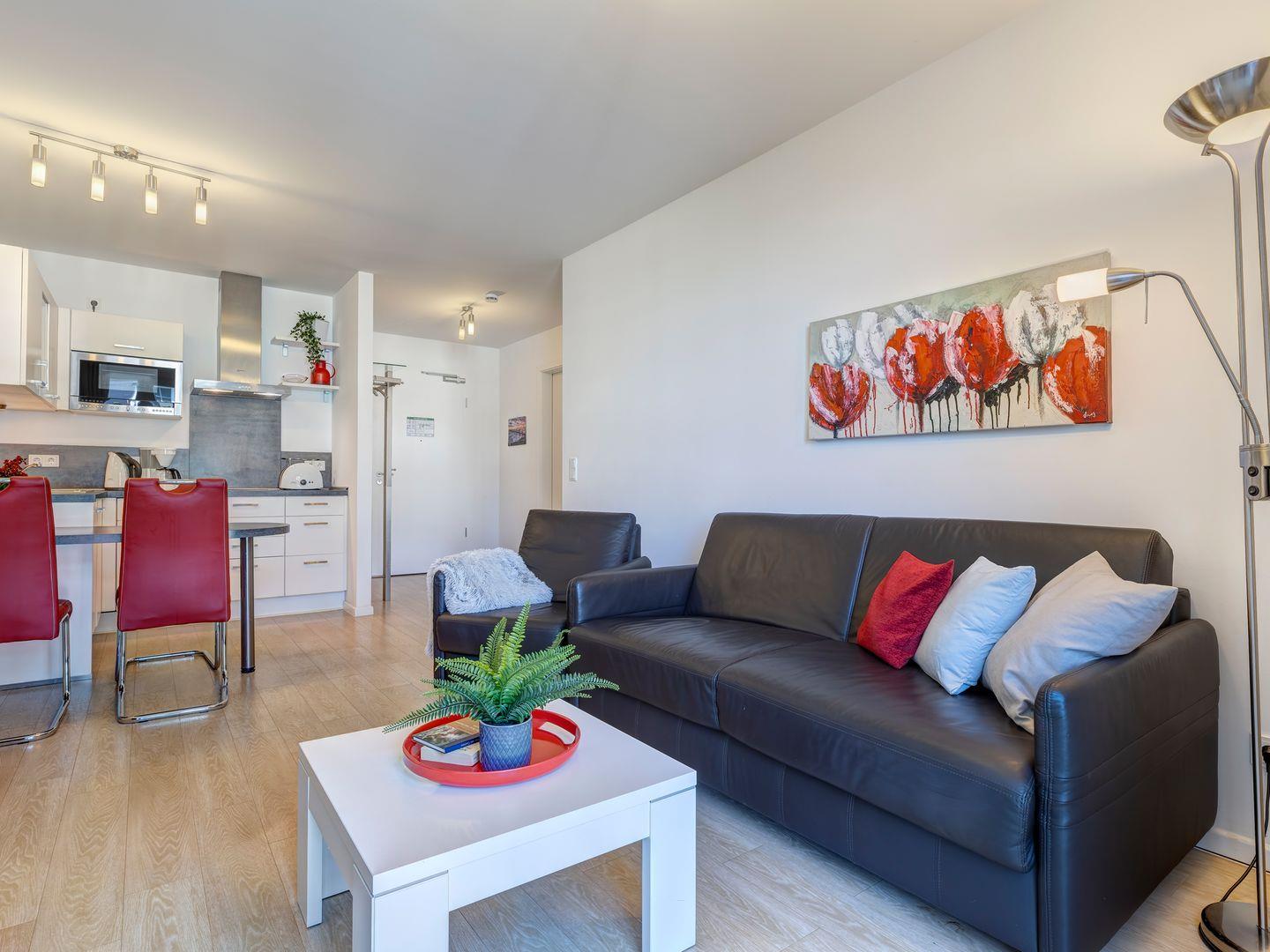 Vom gemütlichen Wohnzimmer aus treten Sie direkt auf den Balkon und lassen Ihren Blick über das malerische Achterwasser schweifen. Die hochwertige und ausziehbare Ledercouch sowie ein bequemer Sessel laden zum Verweilen und Entspannen ein. Ein Esstisch trennt den Wohnbereich von der vollausgestatteten offenen Küche, in der Sie Ihre Speisen mit Leichtigkeit zubereiten können.