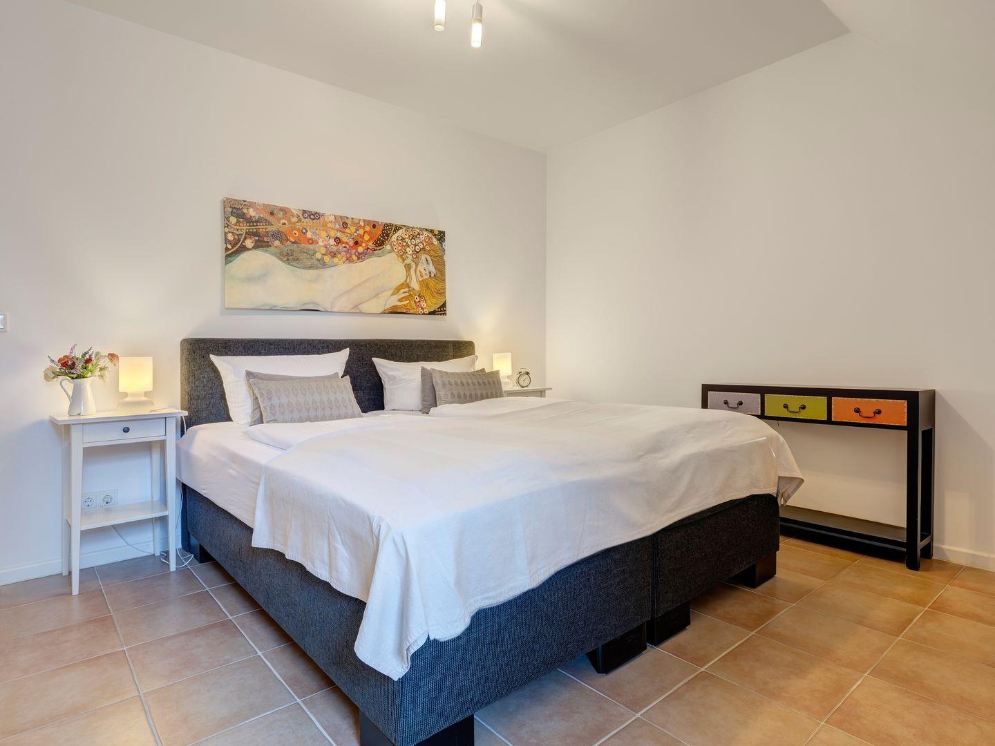 Das Schlafzimmer, modern und exklusiv eingerichtet, bietet ein komfortables Boxspring-Doppelbett und die Möglichkeit, bei Bedarf ein Baby- oder Kinderbett hinzuzufügen. Genießen Sie erholsamen Schlaf oder schauen Sie morgens Ihr (Frühstücks)TV-Programm auf dem zweiten Flachbildfernseher im Bett.