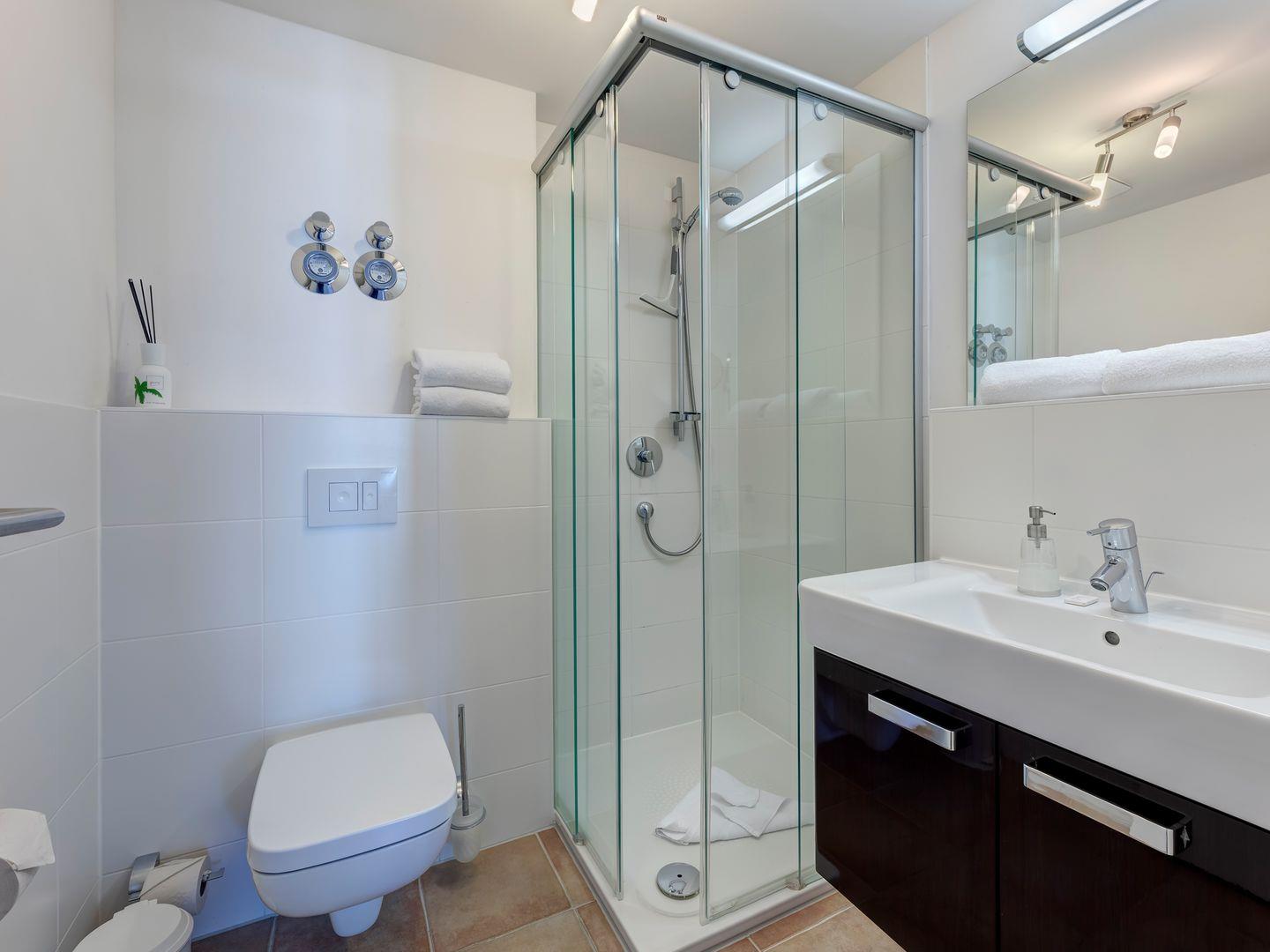 Im Badezimmer erwarten Sie Annehmlichkeiten wie eine ebenerdige Dusche, Kosmetikspiegel und Haartrockner. Das Appartement ist perfekt für zwei Personen, und ein herzliches Willkommen gilt auch einem Kind bis 3 Jahren, das in einem Zustellbett im Schlafzimmer untergebracht werden kann.