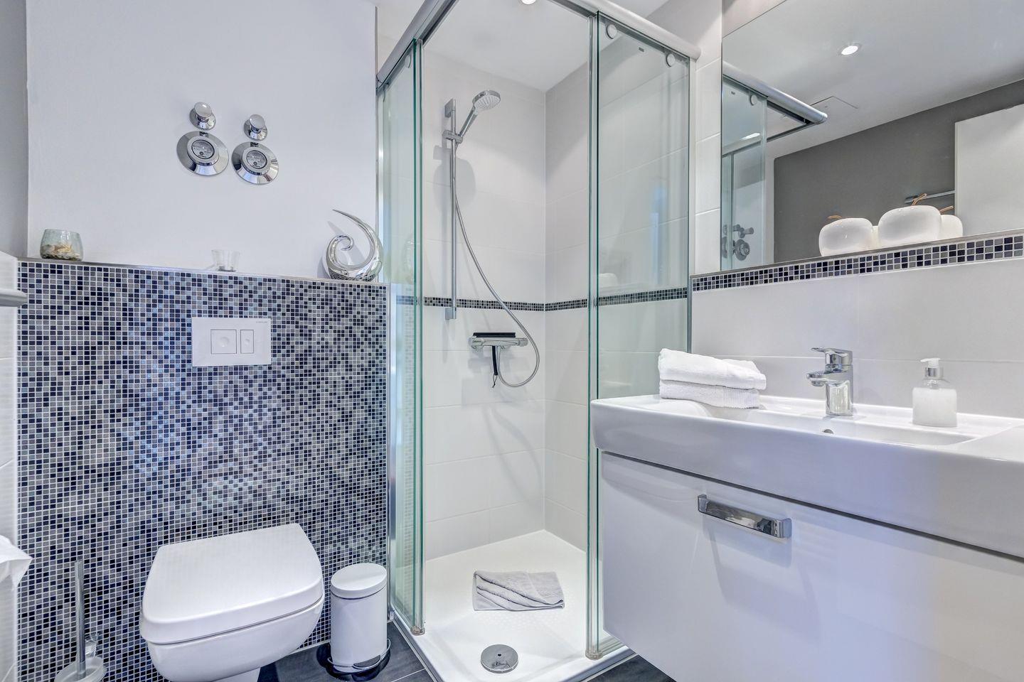 Das Badezimmer beeindruckt mit beheiztem Granitboden und einer bodenebenen Dusche mit Massage-Duschkopf. Ein kleiner Abstellraum bietet Platz für Garderobe und ermöglicht die Aufbewahrung von Schuhen und Gepäck. Für Golfausrüstung und Fahrräder stehen abschließbare Gemeinschaftsflächen zur Verfügung.