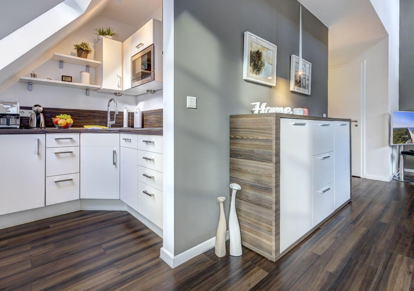 Mit Liebe zum Detail gestaltet, präsentiert sich die Wohnung in warmen Farben, kombiniert mit einer Einrichtung in Weiß und Walnuss im Wohn- und Essbereich – ein Ort der Gemütlichkeit. Die bodentiefen Fenster im Wohnzimmer und der hohe Luftraum über zwei Etagen und einer Deckenhöhe von 5 Metern verleihen der Wohnung einen einzigartigen Charme. Genießen Sie den Glanz des seitlich sichtbaren Achterwassers, wenn die Morgensonne durch die östlichen Fenster strahlt. Verdunkelungs-Plissees ermöglichen ein individuelles Spiel mit dem Sonnenlicht, während Fliegengitter im Wohn- und Schlafbereich für eine mückenfreie Atmosphäre sorgen.