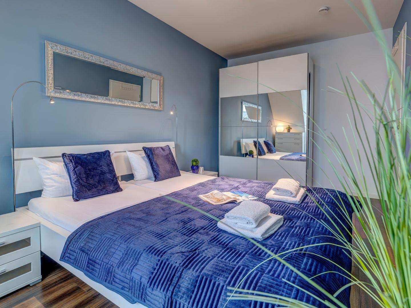 Im Schlafzimmer schaffen wasserblaue Farbtöne an den Wänden und weiße Möbel eine entspannte Atmosphäre von Strand und Wasser. Punktuell und flexibel einstellbare Beleuchtung am Bett laden zu einer kleinen Nachtlektüre ein, ohne den Partner zu stören. Zusätzlich zu den normalen Kopfkissen stehen Ihnen feste Nackenkissen und flauschige Decken zur Verfügung.