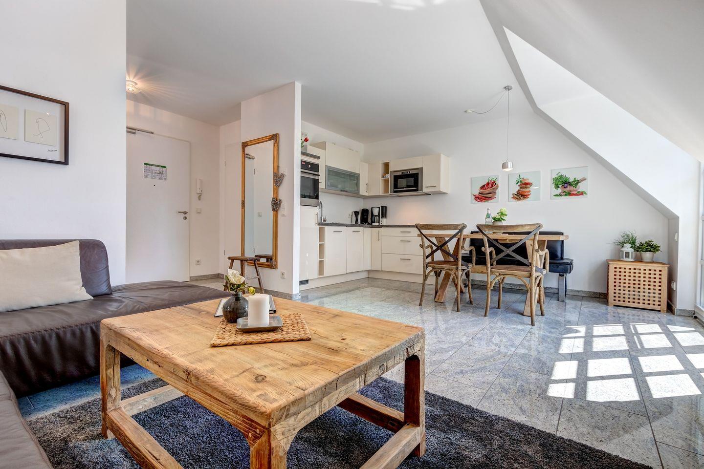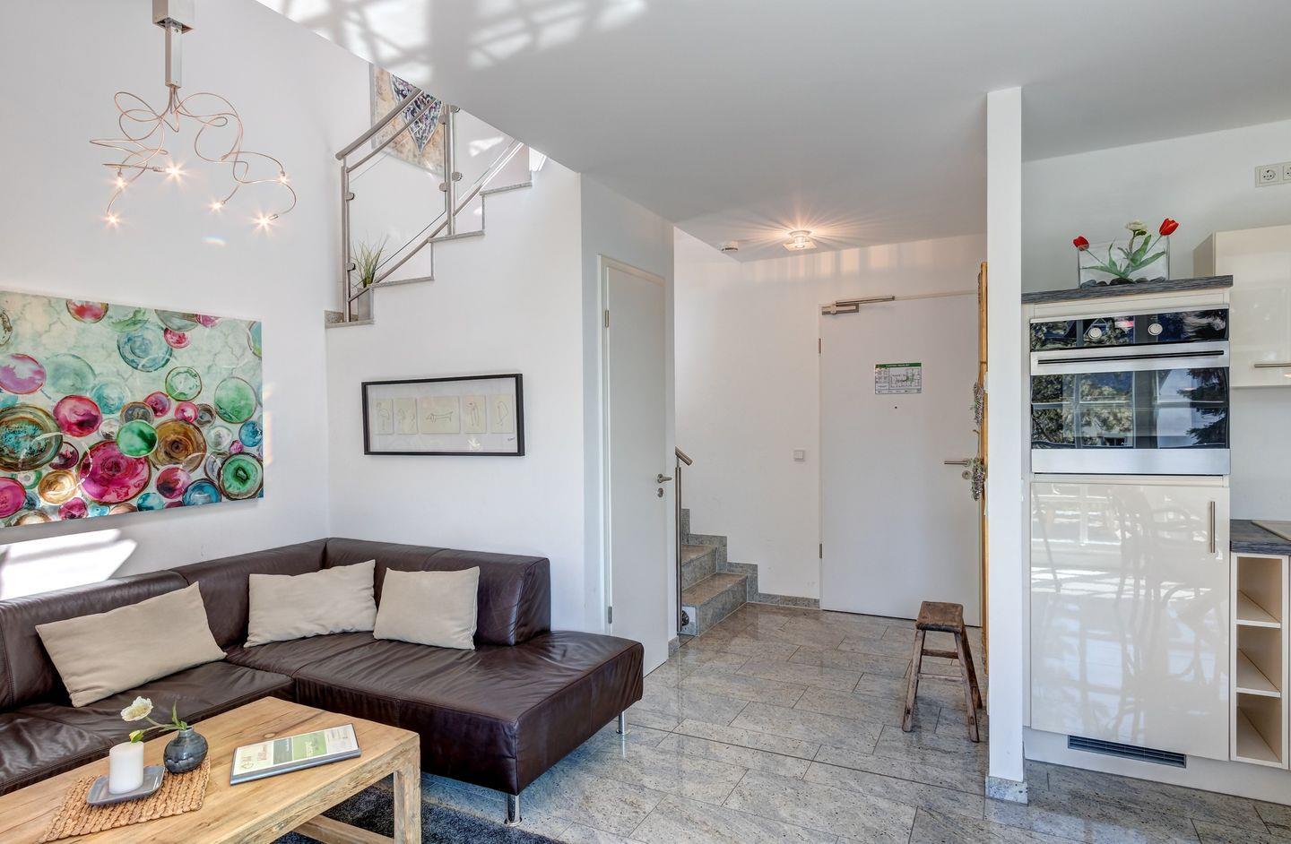 Die erste Ebene der Wohnung bildet den offen gestalteten Wohnbereich. Das Wohnzimmer geht fließend in die moderne Einbauküche mit Vollausstattung über und schafft eine einladende Atmosphäre für gemeinsame Kochabende und entspannte Stunden.