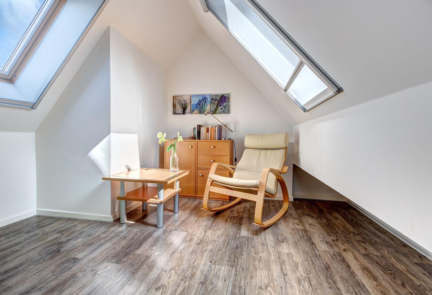 Die oberste Etage beherbergt einen gemütlichen Raum mit einer Leseecke. Dieser Bereich eignet sich hervorragend für entspannte Stunden und bietet einen ruhigen Rückzugsort innerhalb der Wohnung.