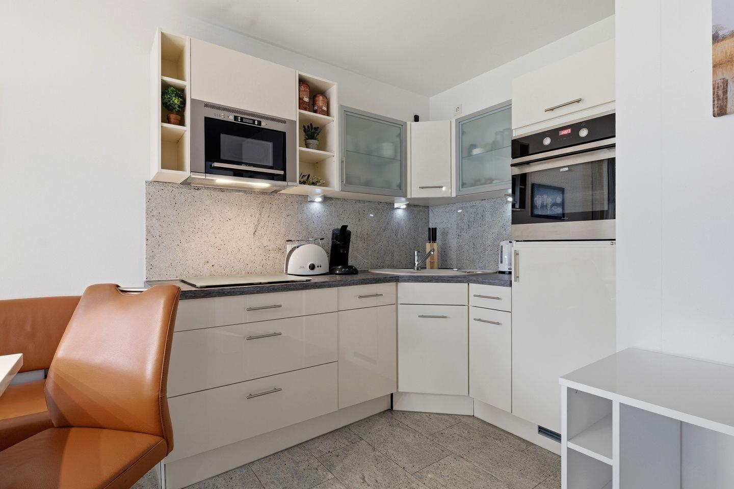 Das Wohnzimmer, durchflutet von natürlichem Licht, verfügt über eine integrierte Einbauküche sowie einen komfortablen Essbereich. Hier können Sie in stilvollem Ambiente köstliche Mahlzeiten zubereiten und genießen. Die obere Etage der Wohnung beherbergt zwei vollwertige Schlafzimmer sowie ein modernes Badezimmer, das durch seine hochwertige Ausstattung Ihren Aufenthalt zusätzlich bereichert.