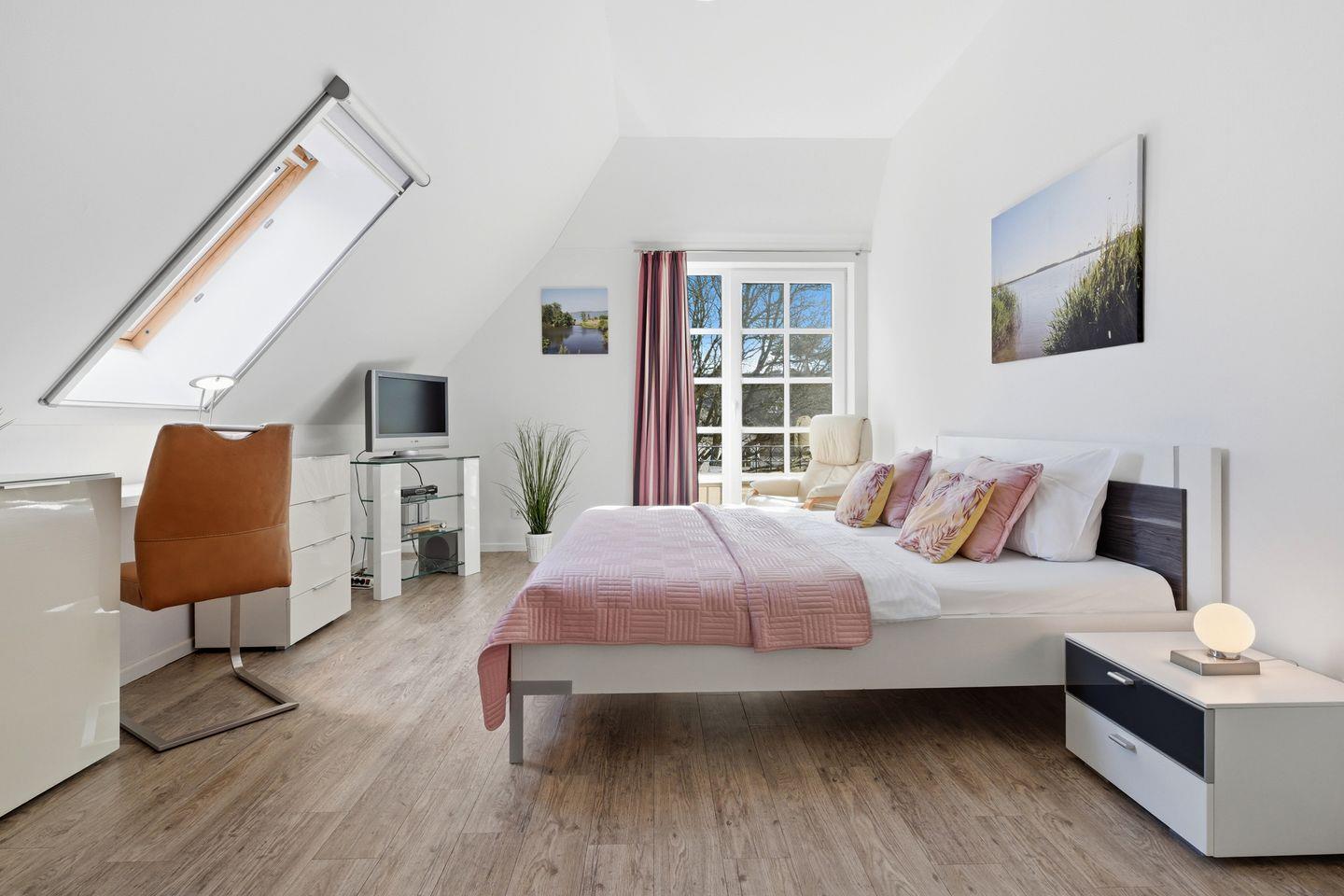 Die großzügige Wohnung erstreckt sich über stolze 74 Quadratmeter, verteilt auf zwei Etagen und ist ideal für bis zu 4 Personen sowie ein kleines Kind. Die besondere Attraktion dieser Unterkunft ist der traumhafte Ausblick vom überdachten Balkon auf das Achterwasser und die naturbelassene Umgebung, der Ihnen zu jeder Tageszeit eine malerische Kulisse bietet.